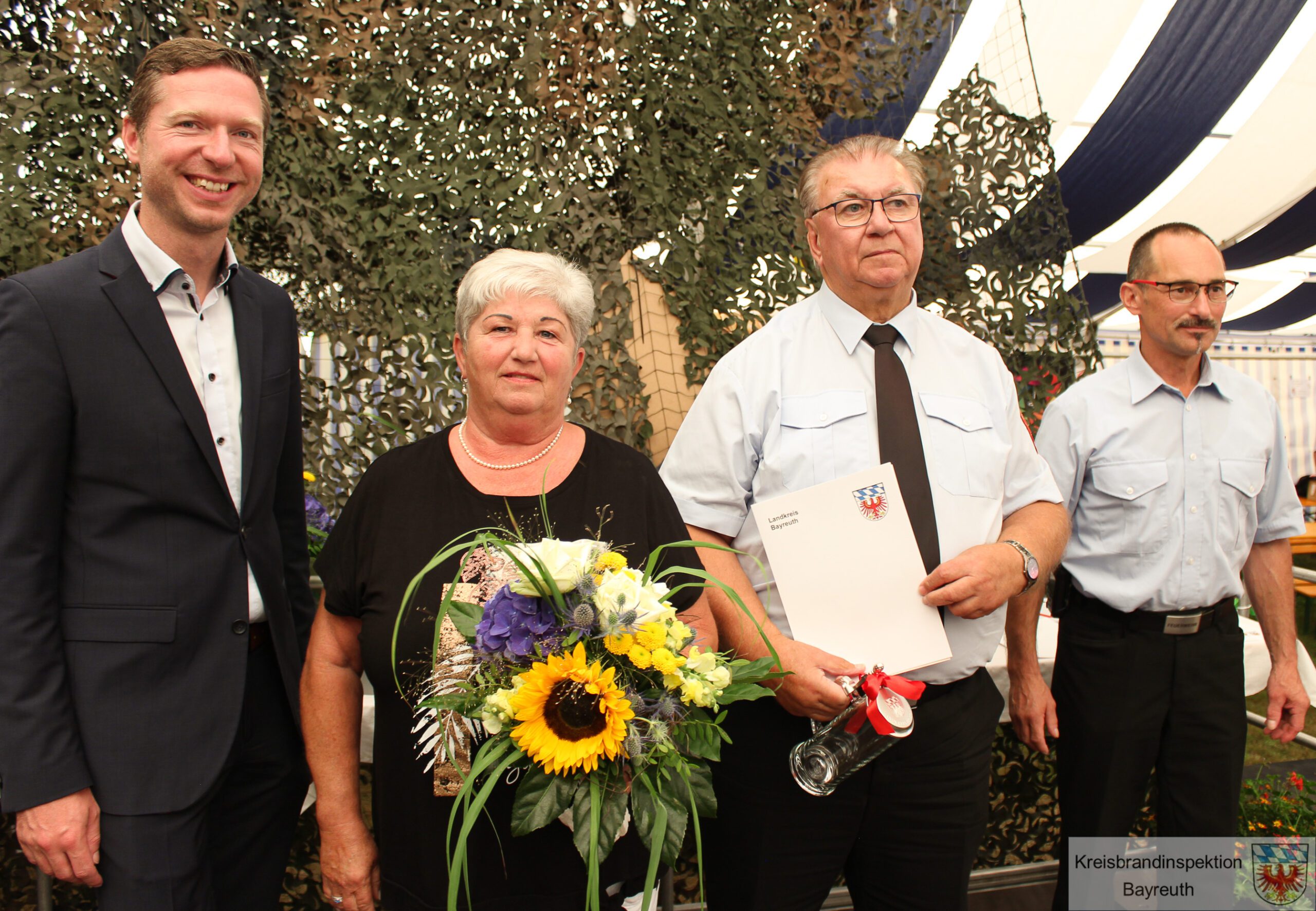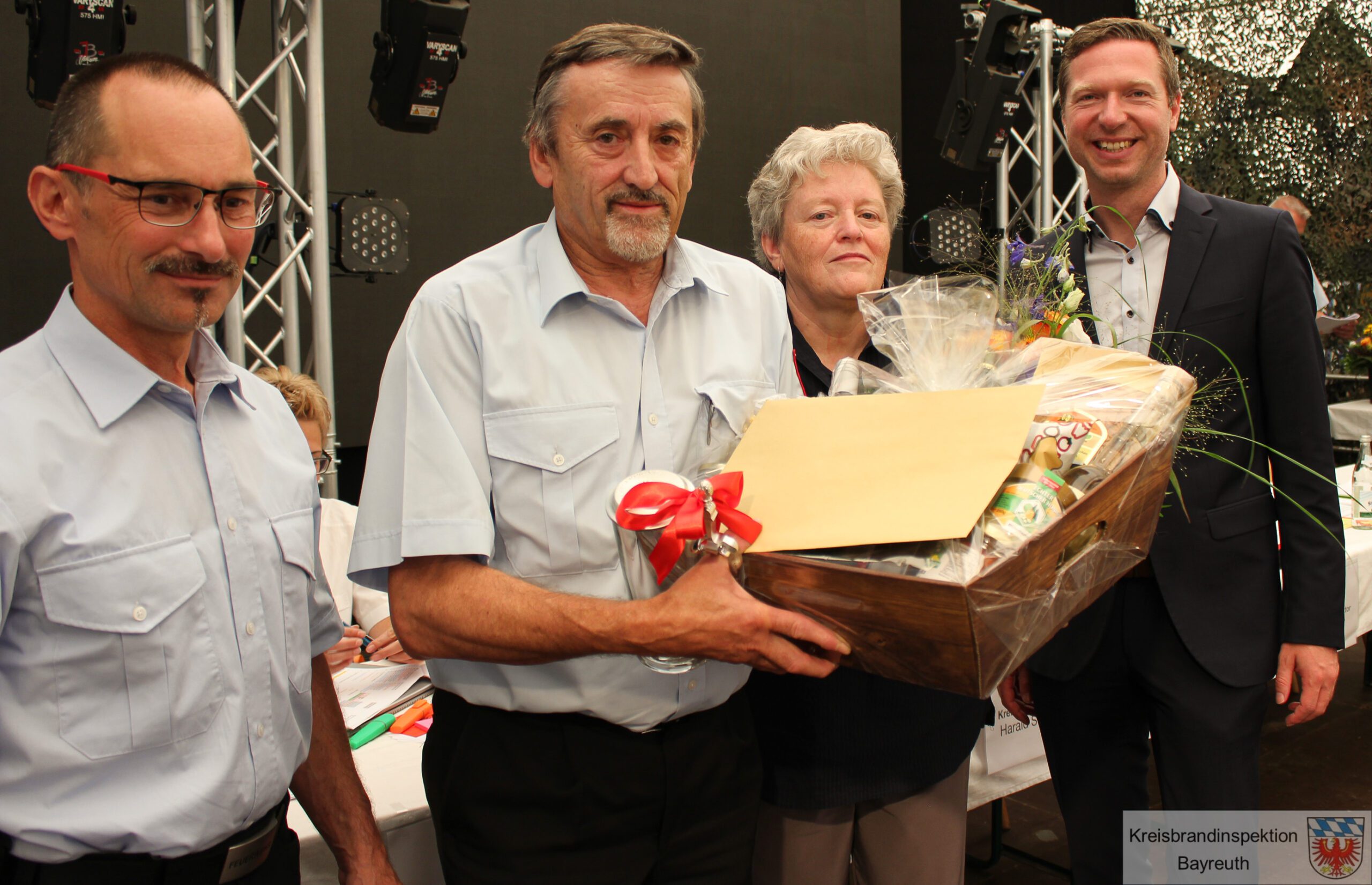 KBI Stefan Steger dankte der Firma Kornburger Abbruch und Erdbau in Weidensees mit ihren Geschäftsführern Apollonia Korburger und Lothar Kornburger. Sie unterstützen die Feuerwehr nicht nur an ihrem Heimatort Weidensees, wo sie für Umbauarbeiten am Gerätehaus Material, Geräte und Arbeitskraft unentgeltlich zur Verfügung gestellt haben. Sie öffnen ihr Betriebsgelände für alle Feuerwehren der Region und stellen dies für Vorführungen, Übungen und Ausbildungen zur Verfügung. Beinahe zu jeder Tages- und Nachtzeit sind sie für die Feuerwehren im Landkreis mit Arbeitskraft und Maschinen erreichbar, wenn sie für die Hilfe beim Abriss von Brandruinen und den Abtransport von Brandgut benötigt werden. Auch hält die Firma ein 17.000 Liter gefülltes Pumpfass inkl. Zugmaschine bereit um die Wehren bei Wald- und Flächenbränden zu unterstützen.