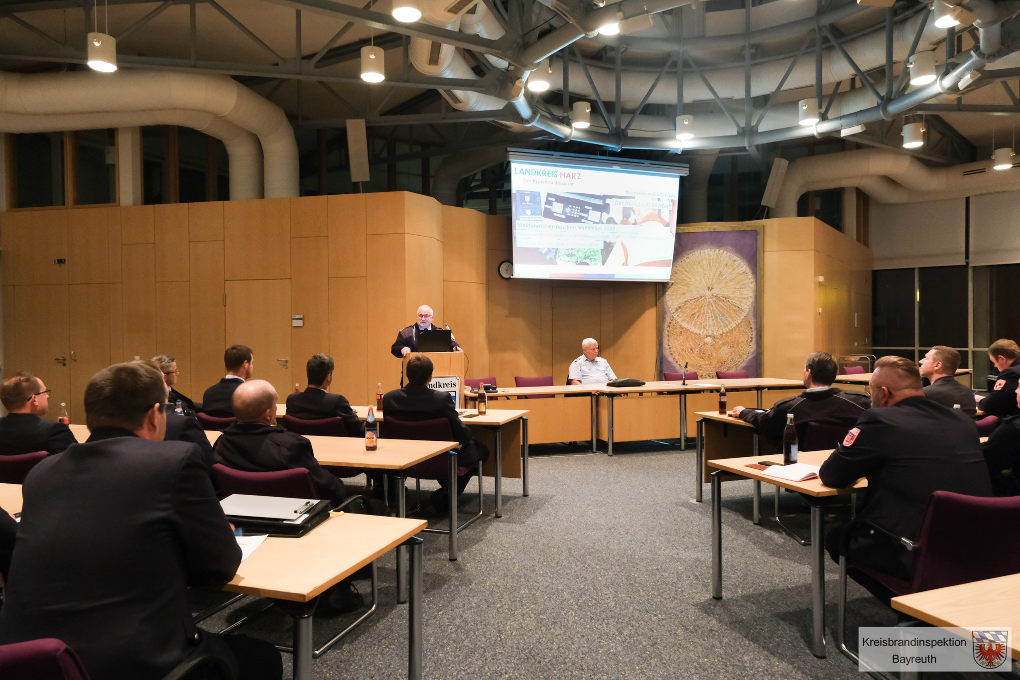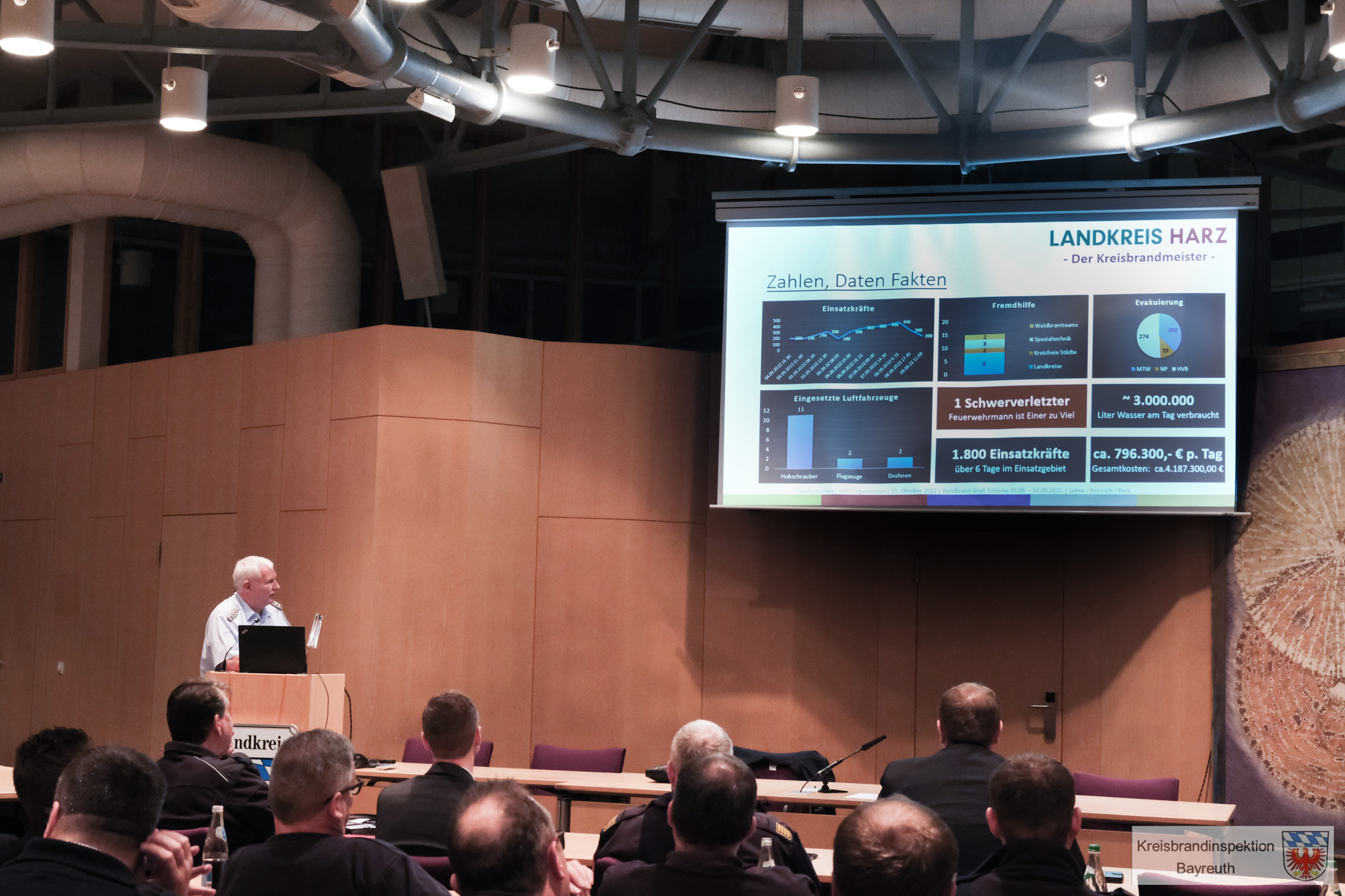 Einen eindrucksvollen Rückblick über die Erfahrungen zum Großbrand am Brocken/Königsberg im September dieses Jahres bot Kreisbrandmeister Kai-Uwe Lohse den Feuerwehrführungskräften des Landkreises Bayreuth am Freitag, den 04. November 2022. Einen lebhaft dargestellten, sehr kurzweiligen Überblick aus Einsatzleiterperspektive erlebten die rund 80 Teilnehmer von der kalten über die warme Lage bis hin zu den daraus gezogenen Lehren. KBM Lohse aus dem Harz, dessen Dienstgrad dem eines bayerischen Kreisbrandrates entspricht, schilderte dabei sehr anschaulich die besondere Problematik des Einsatzgebietes, welches sich inmitten eines Nationalparks befand, sowie die Herausforderungen der ebenso spektakulären wie langwierigen Einsatzentwicklung.