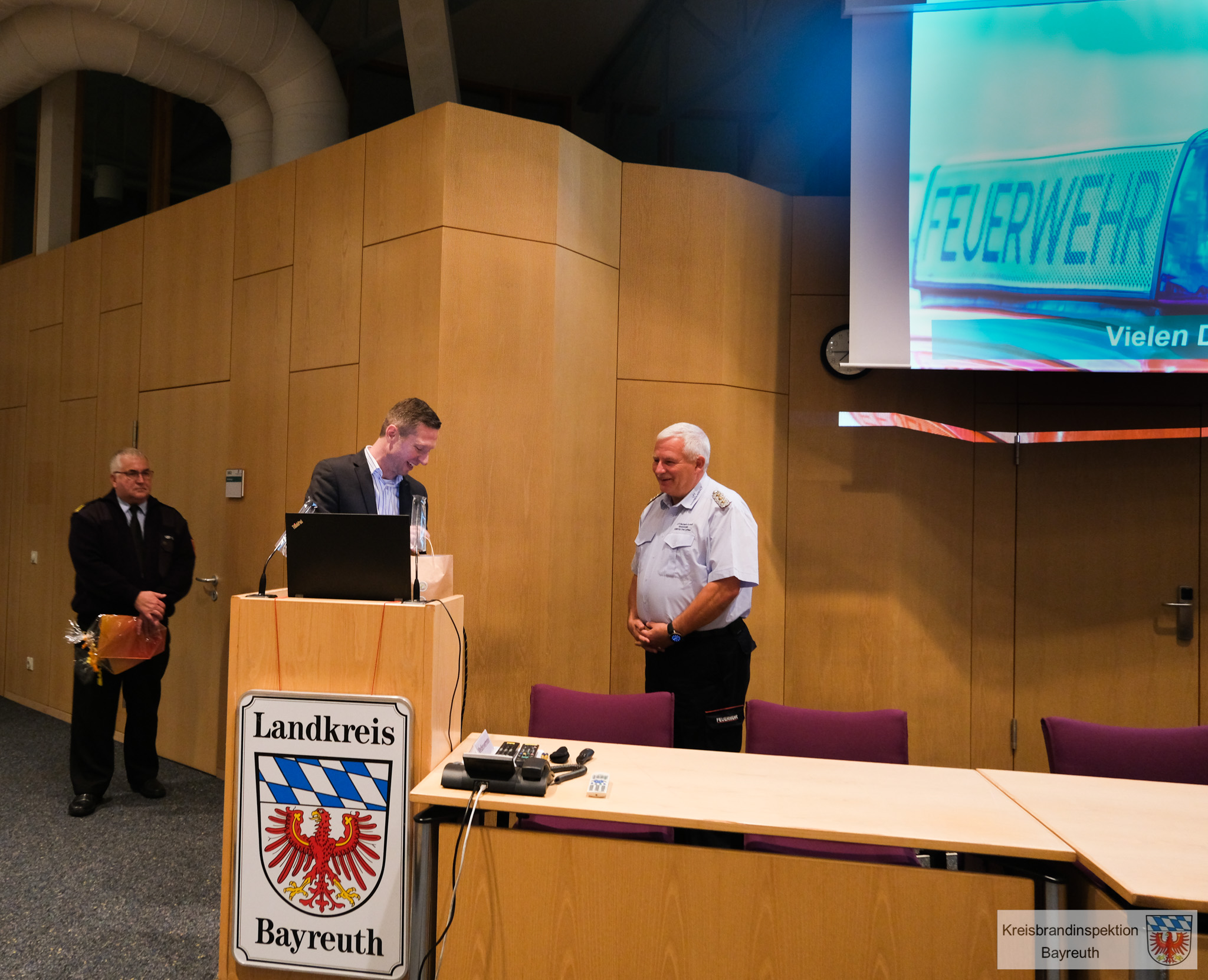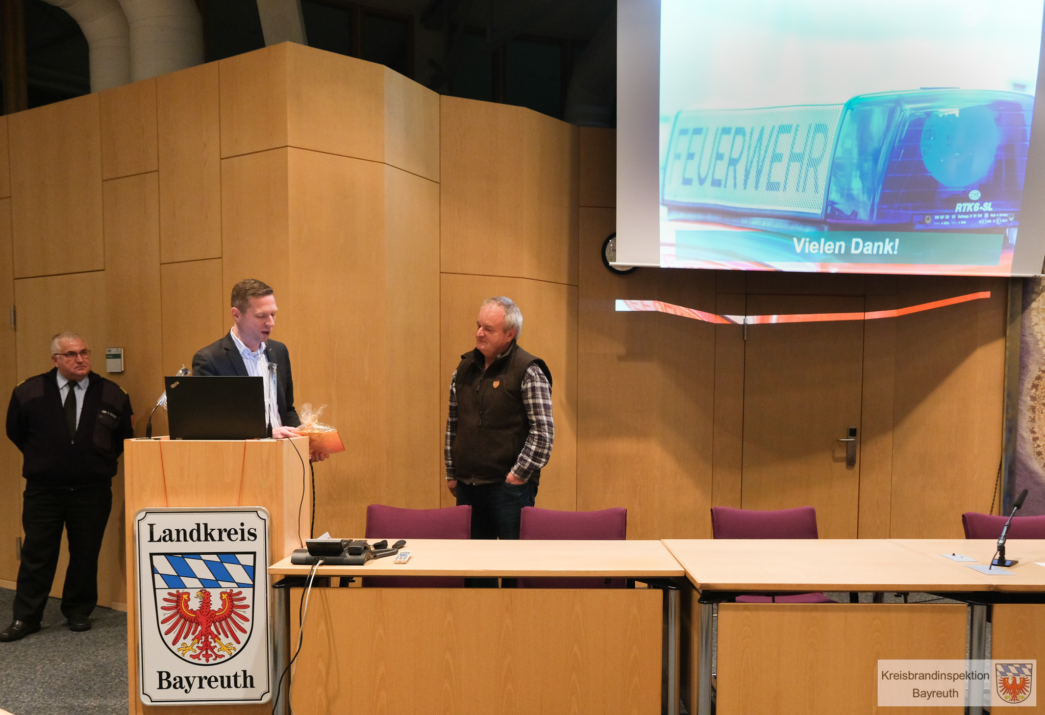 Die beiden Referenten vom Bayerischen Staatsforsten, darunter Martin Hertel vom Forstbetrieb in Fichtelberg, gaben einen Überblick am Beispiel des Ochsenkopfes, was auf die Feuerwehren im Ernstfall zukommen würde. Kreisbrandrat Hermann Schreck resümierte über die sich daraus ergebenden Schlussfolgerungen für unsere Region sowie die Auswirkungen und Handlungsfelder der Feuerwehren. Auch Landrat Florian Wiedemann verfolgte als Gastgeber diesen interessanten Vortrag. Er dankte im Anschluss allen Referenten für die geteilten Eindrücke und überreichte jeweils kleine Gastgeschenke.