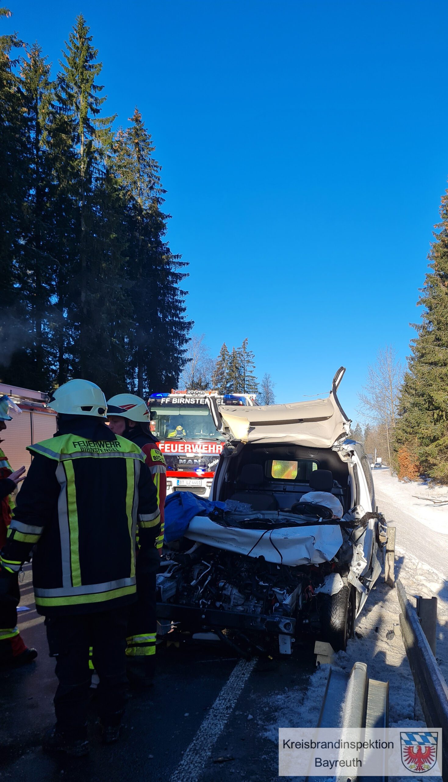 Zu einem Verkehrsunfall, alarmiert nach THL 4 um 08:40 Uhr des 07.02.2023, sind die Feuerwehren Birnstengel, Bischofsgrün, Fichtelberg und Neubau zusammen mit den Kameraden des Nachbarlandkreises der Feuerwehr Wunsiedel auf die Bundesstraße B303 Höhe des Parkplatzes Karches ausgerückt. Ebenfalls dazu alarmiert waren neben den Feuerwehrführungskräften aus beiden Landkreisen der Rettungsdienst, die Bergwacht, ein Fachberater THW und die Polizei. Auf der Bundesstraße kam es am frühen Vormittag zu einem Frontalzusammenstoß zwischen einem LKW und einem PKW. Die Fahrerin des PKW wurde infolge des Unfalls in ihrem Fahrzeug eingeklemmt. Sie ist von der Feuerwehr bis zum Eintreffen des Rettungsdienstes betreut worden. Mittels hydraulischem Rettungsgerät wurde die Verunfallte aus ihrem Auto gerettet, bevor sie an den Rettungsdienst zur weiteren medizinischen Behandlung übergeben werden konnte. Nach der Erstbehandlung an der Unfallstelle wurde die Verletzte mit dem mittlerweile gelandeten Rettungshubschrauber in eine umliegende Klinik geflogen. Für die Dauer der Rettung wurde die Bundesstraße komplett gesperrt. Bis zum Eintreffen der Abschleppdienste, welche die unfallbeteiligten Fahrzeuge bergen mussten, konnte der Verkehr einseitig an der Unfallstelle vorbei geleitet werden. Trotz des Bildes das ich an der Einsatzstelle zeigte hatten die Unfallbeteiligten Glück im Unglück. Die eingeklemmte PKW Fahrerin war während der gesamten Rettung immer bei Bewusstsein und ansprechbar. Der LKW Fahrer hatte einen leichten Schock davon getragen und musste nicht medizinisch versorgt werden. Gegen 12:30 Uhr war der Einsatz für die Feuerwehren beendet.