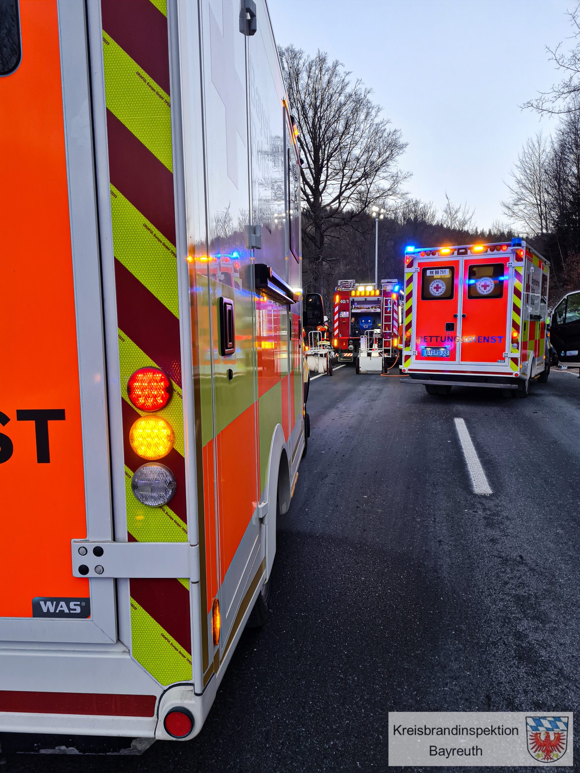 Am Morgen des 09.02.2023 gegen 07:05 Uhr wurden die Feuerwehren Bad Berneck, Birnstengel, Bischofsgrün, Brandholz und Escherlich zusammen mit dem Rettungsdienst und der Polizei zu einem schweren Verkehrsunfall nach Alarmstichwort THL 3 – Person eingeklemmt alarmiert. Beim Eintreffen fanden die Kameraden zwei unfallbeteiligte PKW vor. Entgegen der Alarmmeldung war glücklicherweise keine Person eingeklemmt. Aufgrund des deformierten Fahrzeuges, infolge des Unfalls und dem damit verbundenen seitlichen Aufprall eines der Fahrzeuge, war eine Person in ihrem Fahrzeug eingeschlossen und erlitt mittelschwere Verletzungen. Der Fahrer des zweiten PKW´s trug leichte Verletzungen davon. Beide wurden zur weitern medizinischen Behandlung mit dem Rettungsdienst in umliegende Krankenhäuser gefahren. Die Aufgabe der Feuerwehren war es die Bundesstraße komplett zu sperren bis die Verletzten auf dem Weg in die Krankenhäuser waren. Sie stellten an der Einsatzstelle den vorsorglichen Brandschutz sicher und befreiten die Unfallbeteiligten aus ihren Fahrzeugen um sie dem Rettungsdienst übergeben zu können. Auslaufende Betriebsstoffe wurden ebenfalls von den Kameraden abgebunden. Der Verkehr konnte nach dem Abtransport der Verletzten und vor Eintreffen des zweiten Fahrzeuges eines Abschleppunternehmens, einseitig an der Unfallstelle vorbei geleitet werden. Insgesamt befanden sich 42 Kameradinnen und Kameraden für 2,5h im Einsatz.