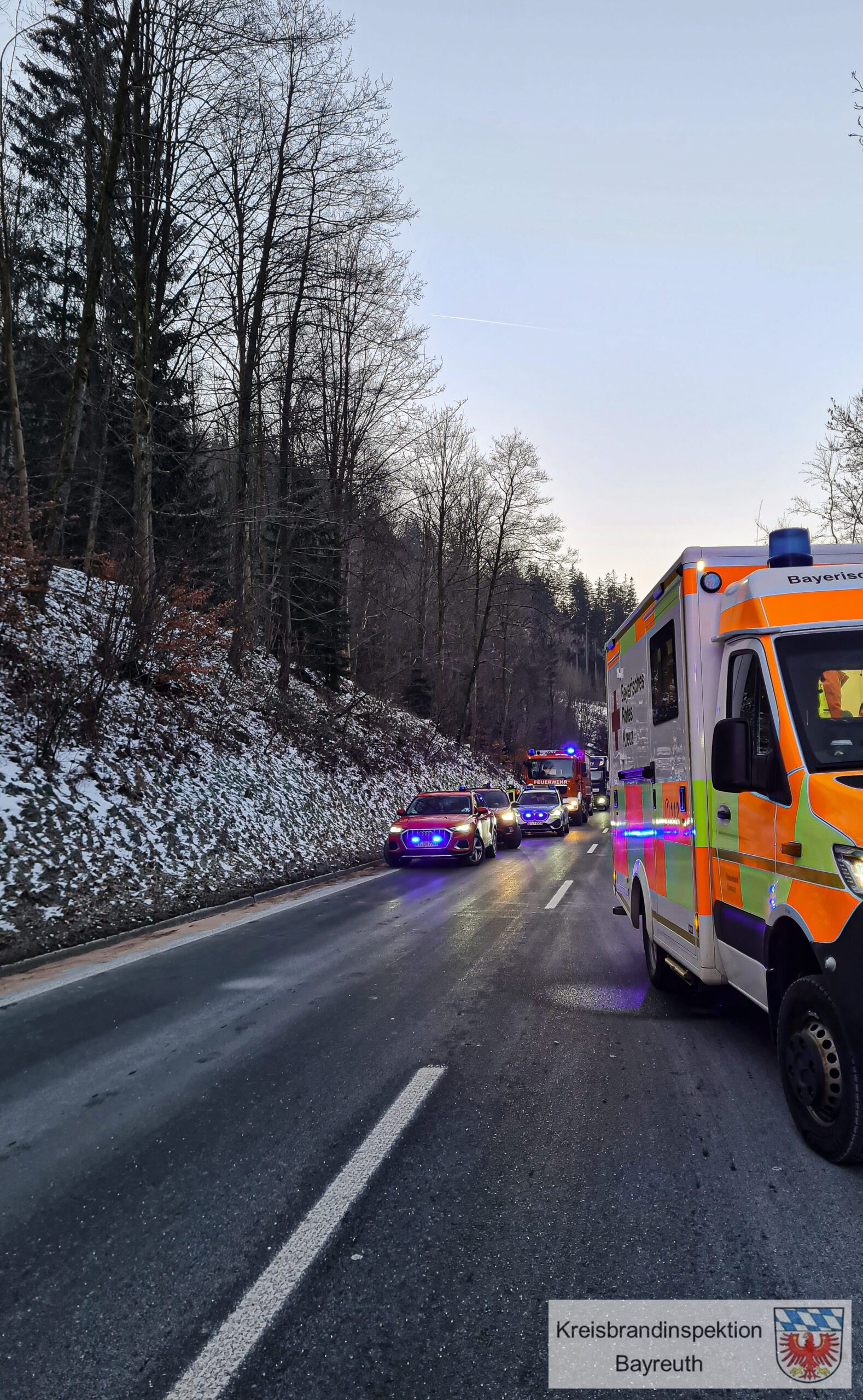Am Morgen des 09.02.2023 gegen 07:05 Uhr wurden die Feuerwehren Bad Berneck, Birnstengel, Bischofsgrün, Brandholz und Escherlich zusammen mit dem Rettungsdienst und der Polizei zu einem schweren Verkehrsunfall nach Alarmstichwort THL 3 – Person eingeklemmt alarmiert. Beim Eintreffen fanden die Kameraden zwei unfallbeteiligte PKW vor. Entgegen der Alarmmeldung war glücklicherweise keine Person eingeklemmt. Aufgrund des deformierten Fahrzeuges, infolge des Unfalls und dem damit verbundenen seitlichen Aufprall eines der Fahrzeuge, war eine Person in ihrem Fahrzeug eingeschlossen und erlitt mittelschwere Verletzungen. Der Fahrer des zweiten PKW´s trug leichte Verletzungen davon. Beide wurden zur weitern medizinischen Behandlung mit dem Rettungsdienst in umliegende Krankenhäuser gefahren. Die Aufgabe der Feuerwehren war es die Bundesstraße komplett zu sperren bis die Verletzten auf dem Weg in die Krankenhäuser waren. Sie stellten an der Einsatzstelle den vorsorglichen Brandschutz sicher und befreiten die Unfallbeteiligten aus ihren Fahrzeugen um sie dem Rettungsdienst übergeben zu können. Auslaufende Betriebsstoffe wurden ebenfalls von den Kameraden abgebunden. Der Verkehr konnte nach dem Abtransport der Verletzten und vor Eintreffen des zweiten Fahrzeuges eines Abschleppunternehmens, einseitig an der Unfallstelle vorbei geleitet werden. Insgesamt befanden sich 42 Kameradinnen und Kameraden für 2,5h im Einsatz.