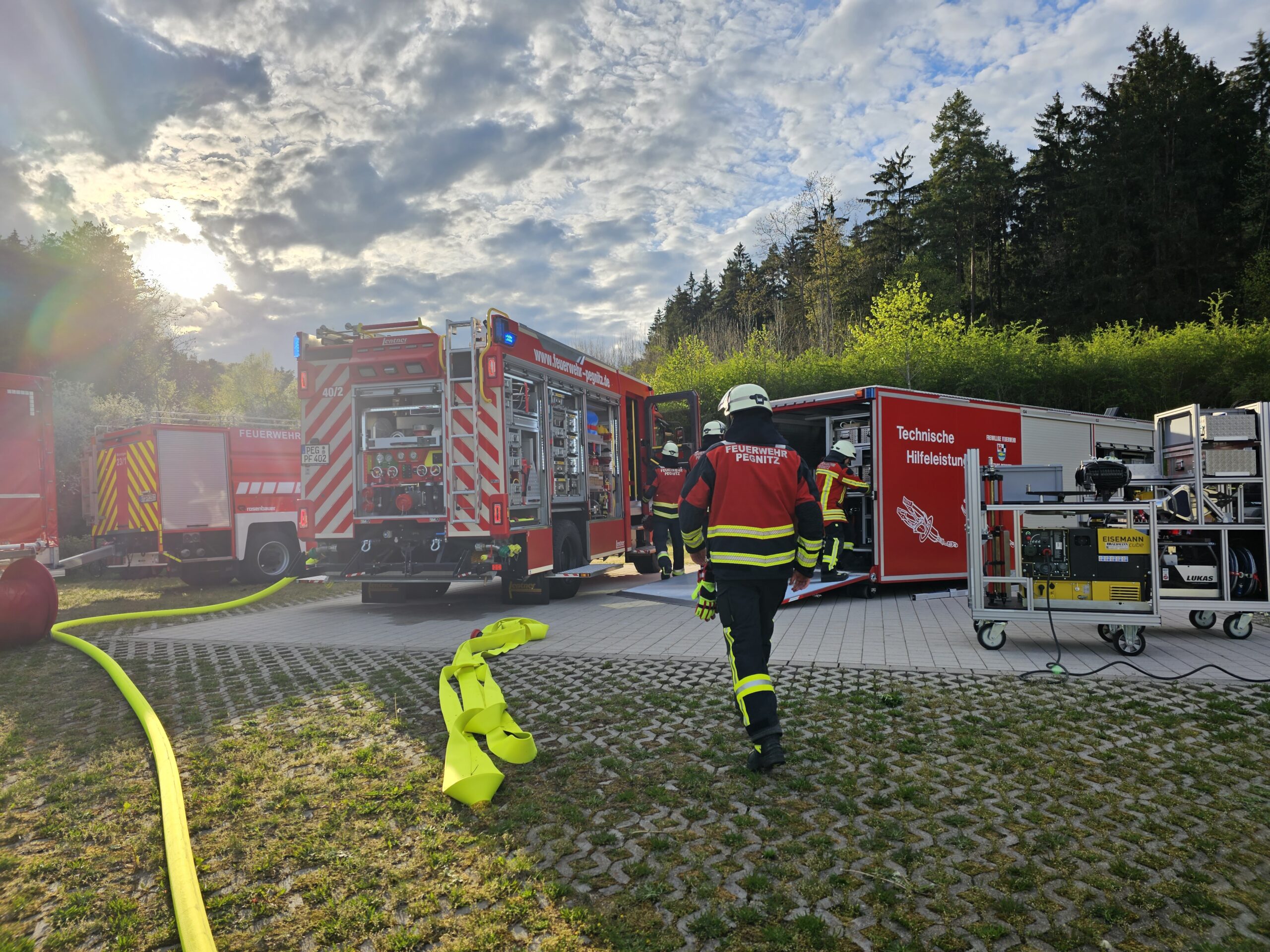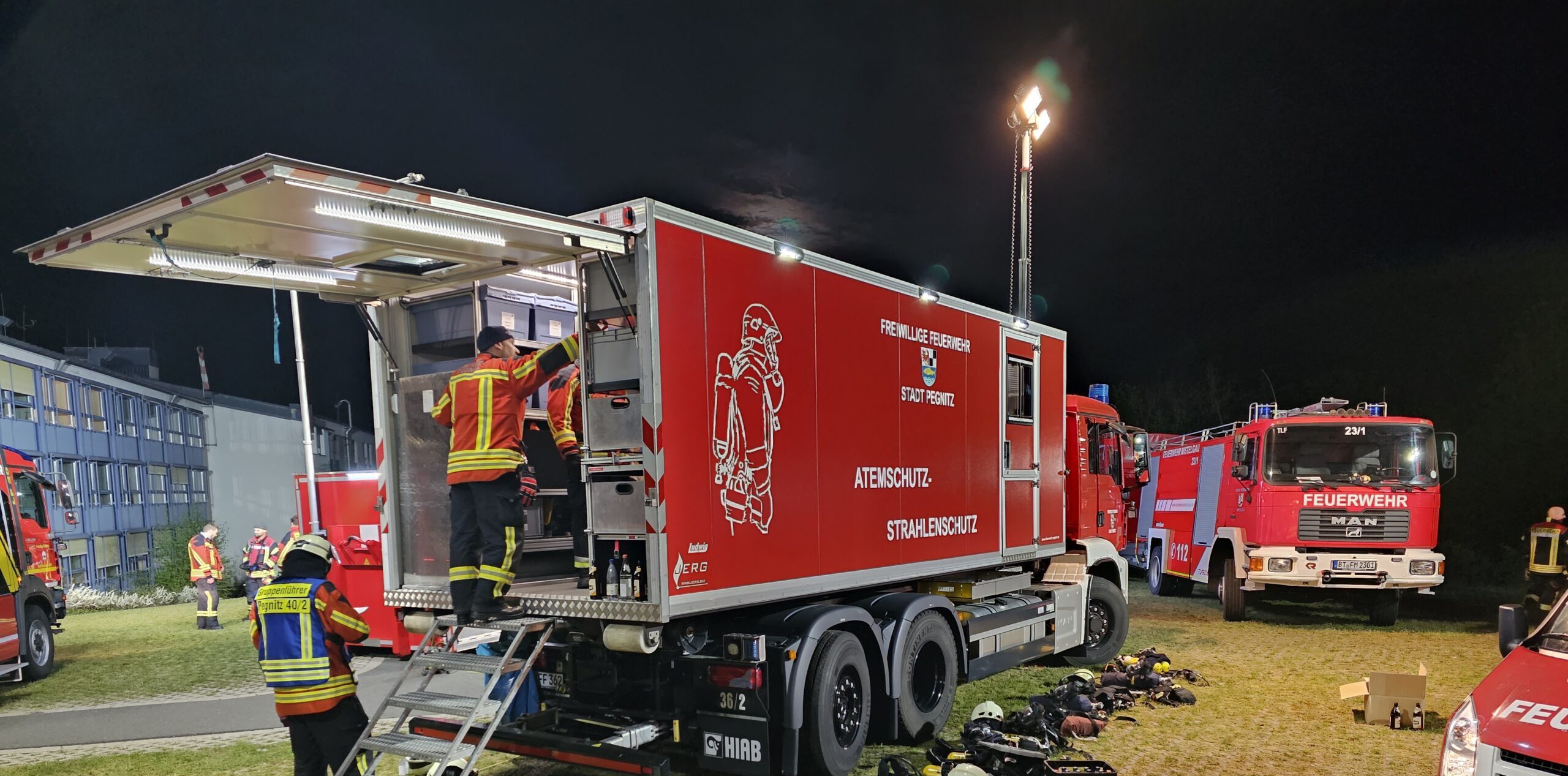 Spezialkräfte der Polizei „GG SBC“, der Feuerwehr der US Army „USAG Bavaria Fire-rescue“ vom Standort Grafenwöhr, das Bayernwerk, die Atemschutz-Strahlenschutz Einheit, der Abrollbehälter Umwelt, Gefahrgut Einheiten mit CSA Schutzanzügen der Freiwilligen Feuerwehren im Landkreis Bayreuth wurden an die Einsatzstelle alarmiert. Eine Gebietsabsicherung für die Autobahn und die Stadt Pegnitz wurde durch die Freiwillige Feuerwehr Bindlach notwendig. Für die anlaufende Evakuierung der Patienten welche eine Zeit von rund drei Stunden beanspruchte wurden etliche Fahrzeuge und Personal aus dem Kreisverband Bayreuth des Bayerischen Roten Kreuz, aber auch der Nachbarkreisverbände Mittelfranken und der Oberpfalz, dem Malteser Hilfsdienst aus Waischenfeld, dem ASB Verband mit Fahrzeugen aus Velden und Auerbach und SKS Bayreuth zusammen gezogen. 18 Rettungswägen und 12 Krankentransportwägen wurden neben dem Hubschrauber „Christoph 20“ zusammen mit einem Leitenden Notarzt und vier weiteren Ärzten, zur Verlegung der Patienten an die Klinik alarmiert. Die Klinik mobilisierte alle zur Verfügung stehenden Mitarbeiter zur Mithilfe bei der Evakuierung.