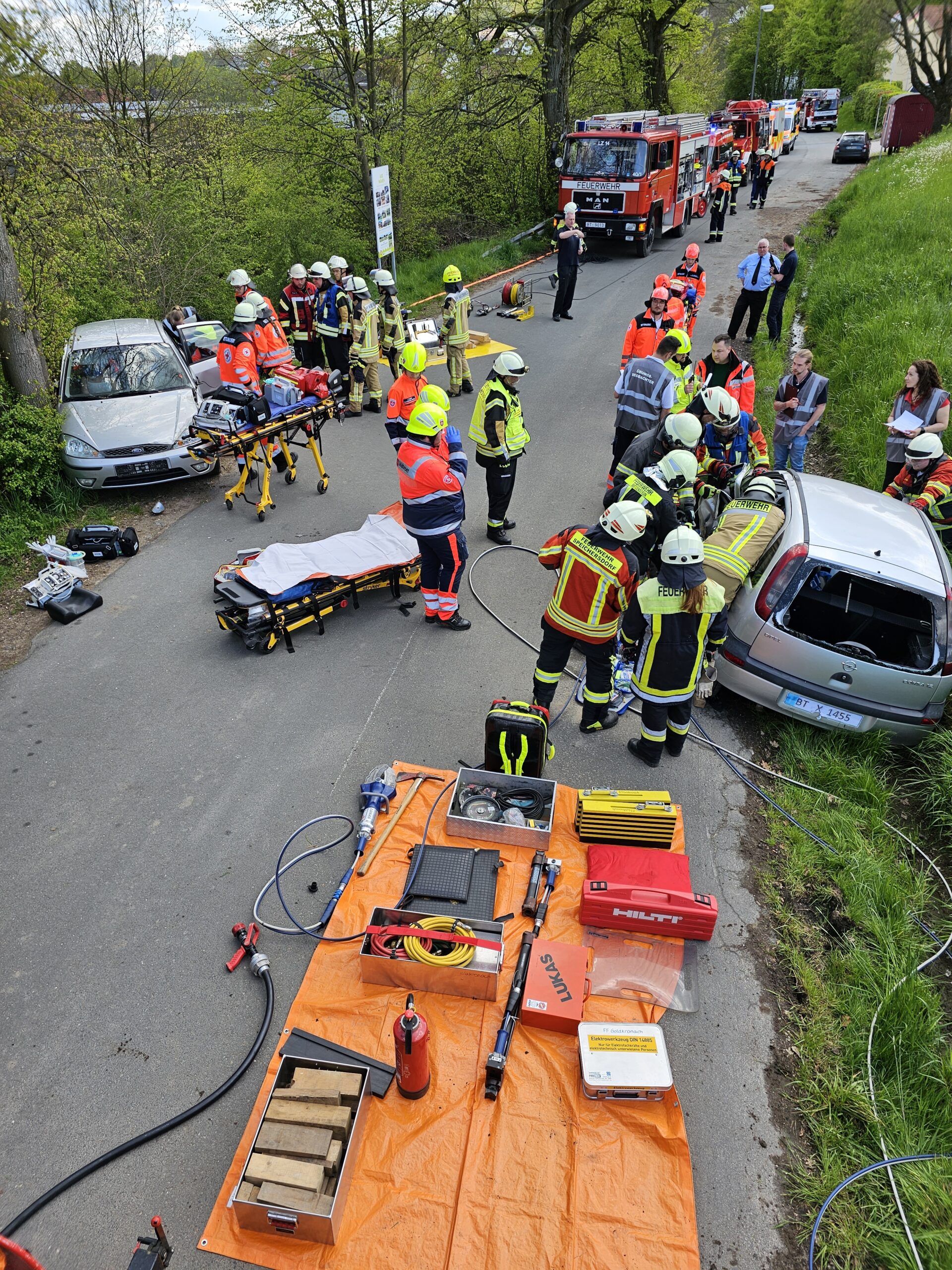Im Rahmen einer Tagesveranstaltung kombiniert aus Theorie und Praxis haben sich die Ausbilder der Kreisbrandinspektion Bayreuth wieder einiges einfallen lassen. Am Vormittag standen die Grundlagen der Fahrzeugtechnik auf dem Ausbildungsplan. Hier wurden die Sicherheitstechnik in Fahrzeugen und Rettungstechniken bei neuen Fahrzeugen den Teilnehmern von Feuerwehr und Rettungsdienst näher gebracht. Eine Checkliste zur patientengerechten Rettung mit Bezug auf die Einsatzpraxis sowie die Rolle eines Notarztes bei der patientengerechten Rettung wurden vor der Mittagspause und somit dem großen Praxisteil mit den Teilnehmern erarbeitet. In praktischer Weise konnten die Teilnehmer sich die Rettungsgeräte der Feuerwehr und des Rettungsdienstes genauer ansehen und auch ausprobieren. Danach folgten zwei große Einsatzübungen die das erlernte in der Theorie gleich mit der Praxis in Einklang bringen konnten. Die Teilnehmer mussten einen Verkehrsunfall mit mehreren beteiligten Verletzten abarbeiten und im Anschluss wurden sie noch zu einer Gasverpuffung gerufen, welche sich in dem unwegsamen Gelände zu einer herausfordernden Rettung über einen steilen Hang entwickelte. Das Resümee der Übung konnte sich sehen lassen. Die Teilnehmer haben ihr theoretisches Wissen hervorragend im Praxisteil anwenden können und nehmen sich in ihren Alltag sehr viel angeeignetes Wissen mit nach Hause. Durch das schnuppern in den jeweiligen Feuerwehr- und Rettungsdienstbereich und dem Wissen was die jeweilig andere Blaulichtorganisation für Aufgaben bei einem Einsatz im Ernstfall zu bewältigen hat, konnte die reibungslose Zusammenarbeit noch einmal intensiviert werden. Große Freude und Zufriedenheit herrschte auch bei den Ausbildern der Veranstaltung. So hatte es sich ja schon fast traditionell eingebürgert jährlich einen Ausbildungstag dieser Art stattfinden zu lassen, bis Corona alles zum Stillstand brachte. Teilgenommen haben die Freiwilligen Feuerwehren Betzenstein, Bindlach, Donndorf, Goldkronach, Mistelgau, Nankendorf, Nemmersdorf, Neunkirchen, Seybothenreuth, Steinachtal, Speichersdorf, Troschenreuth, Warmensteinach, Weidenberg und Ramsenthal zusammen von Rettungsdienstseite mit dem Roten Kreuz Bayreuth, der SKS Ambulanz und den Maltesern aus Waischenfeld. Der ärztliche Leiter Rettungsdienst Dr. Christian Haag und von Feuerwehrseite Dr. Stefan Eigl unterstützen den Lehrgang ebenfalls.