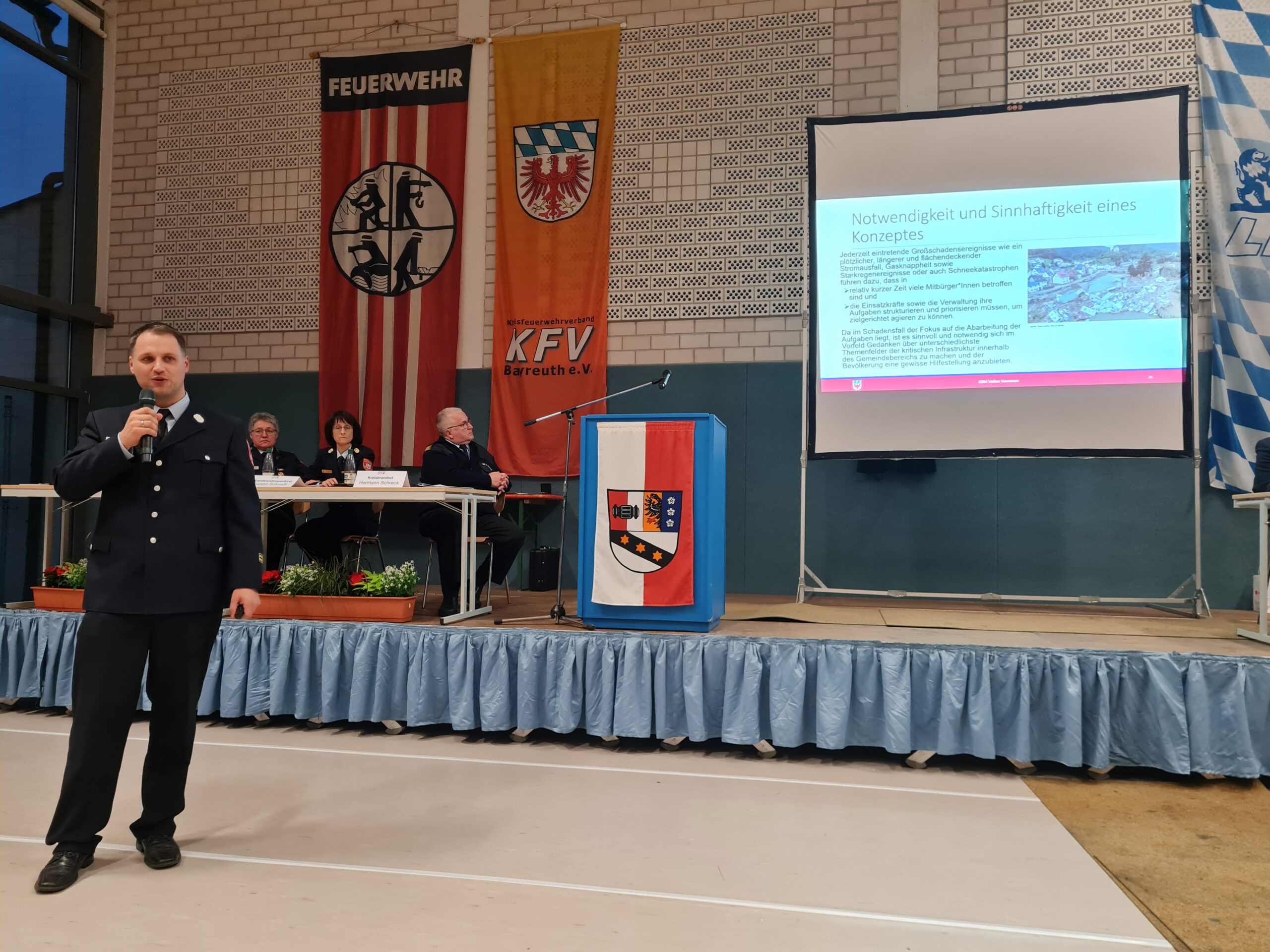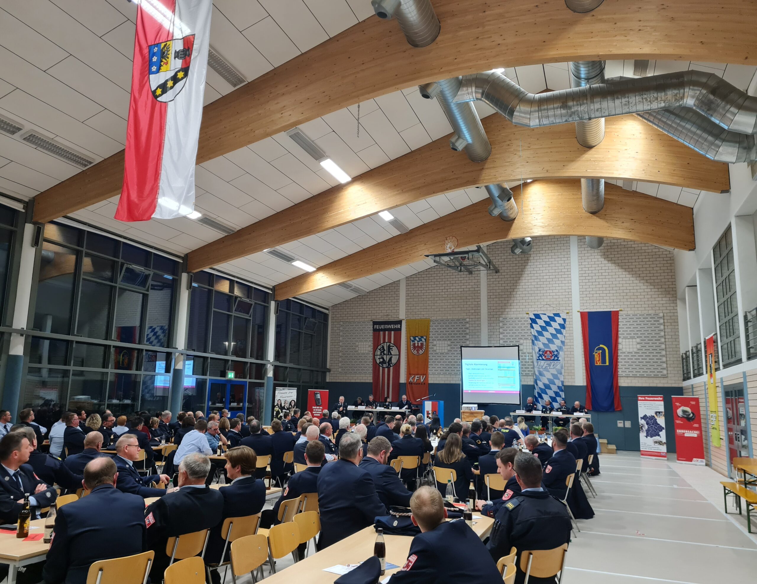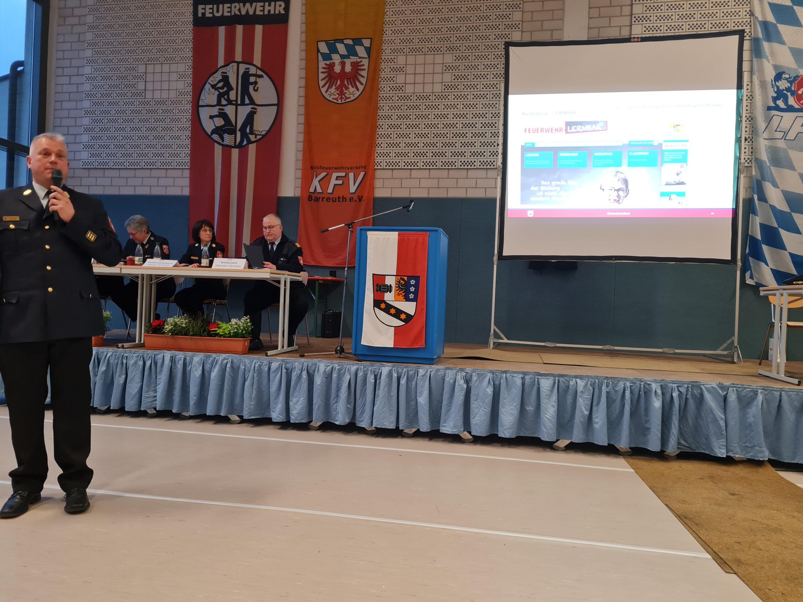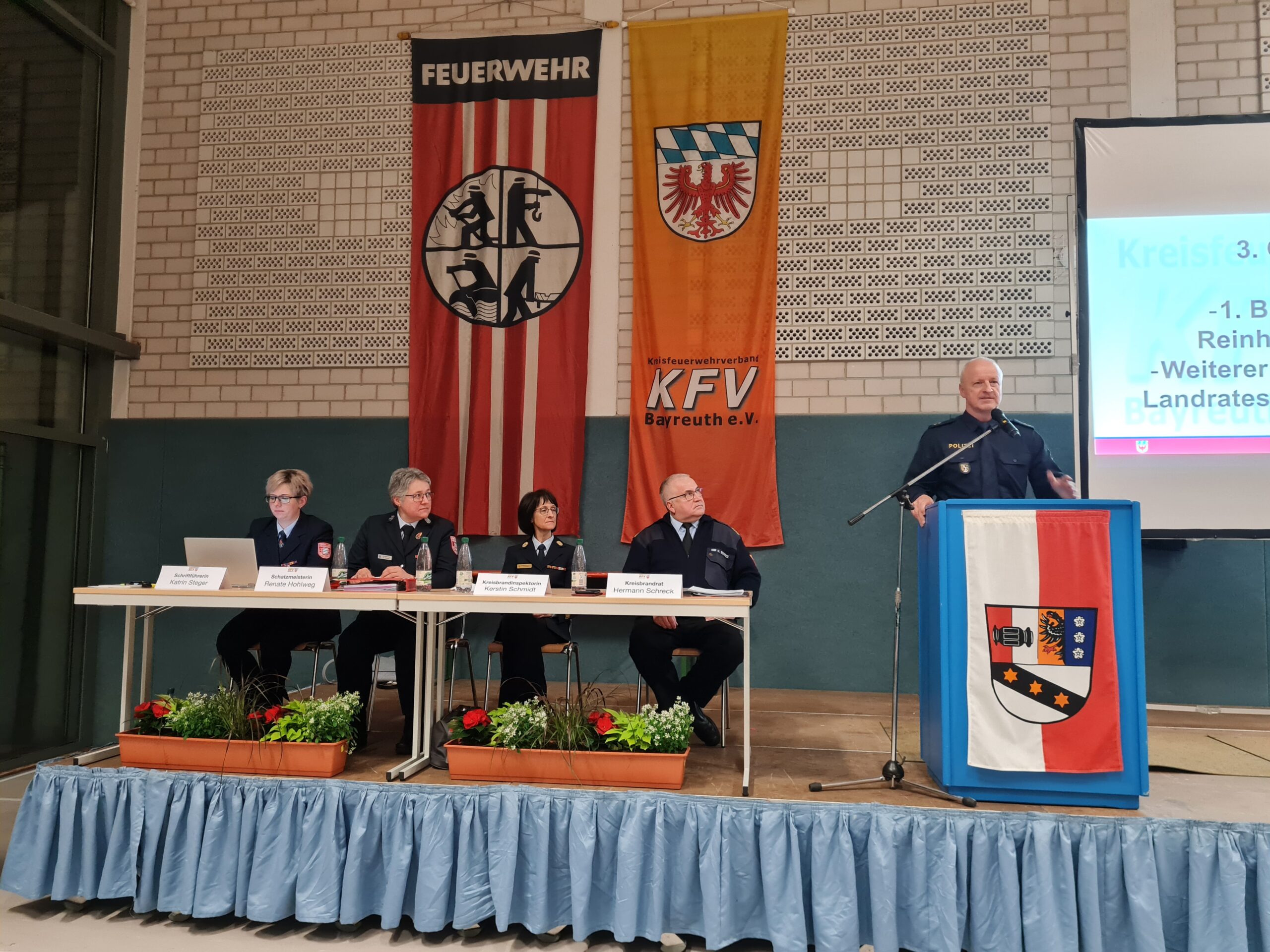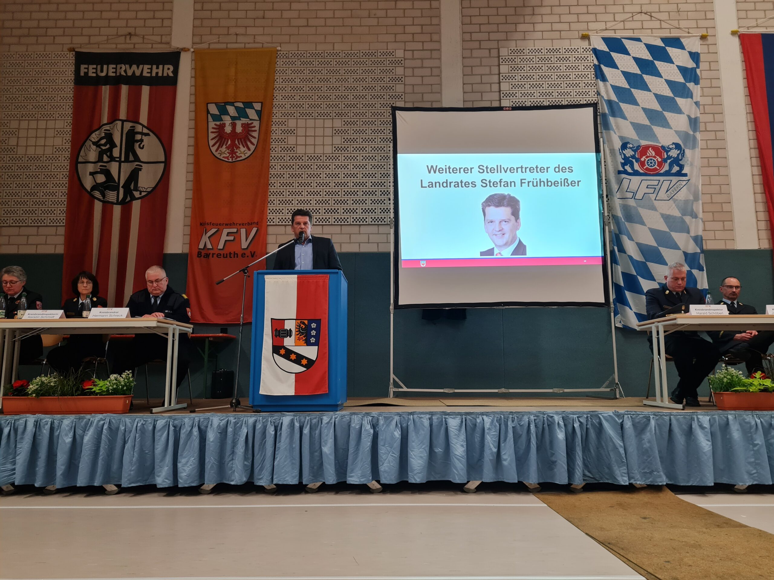 Anlässlich der Verbandsversammlung des Kreisfeuerwehrverbandes Bayreuth e.V. begrüßte KBR Hermann Schreck neben dem weiteren Stellvertreter des Landrates Stefan Frübeißer, den 1. Bürgermeister Reinhard Preißinger mit seinem Gemeinderat aus Seybothenreuth, auch zahlreiche Bürgermeisterinnen und Bürgermeister der Kommunen oder ihre entsandten Vertreter aus dem Landkreis. Die Altlandräte Dr. Klaus-Günther Dietel, Hermann Hübner und Vertreterinnen und Vertreter aus dem Landratsamt sind der Einladung ebenfalls gefolgt. Weiter durfte er außerdem Kameraden der Blaulichtorganisationen wie dem THW, dem Rettungsdienst, der Polizei und der ILS Bayreuth / Kulmbach, den Verbandsausschuss des KFV und unseren Notfallseelsorger Pfarrer Günther Daum begrüßen. Die Kameraden SBR Ralph Hermann und SBI Stephan Fößel aus dem ILS Bereich sowie zahlreiche Ehrenkreisbrandinspektoren, Ehrenkreisbrandmeister, Kreisbrandinspektoren a.D., Kreisbrandmeister a.D., Schiedsrichter und besonderen Führungskräfte des Landkreises, Vorstände und Kommandanten unserer Wehren die Kinderfeuerwehrbeauftragten der jeweiligen Inspektionen, die Mitgliedsfeuerwehren unseres Kreisfeuerwehrverbandes haben der Versammlung beigewohnt und sind eingangs begrüßt worden.