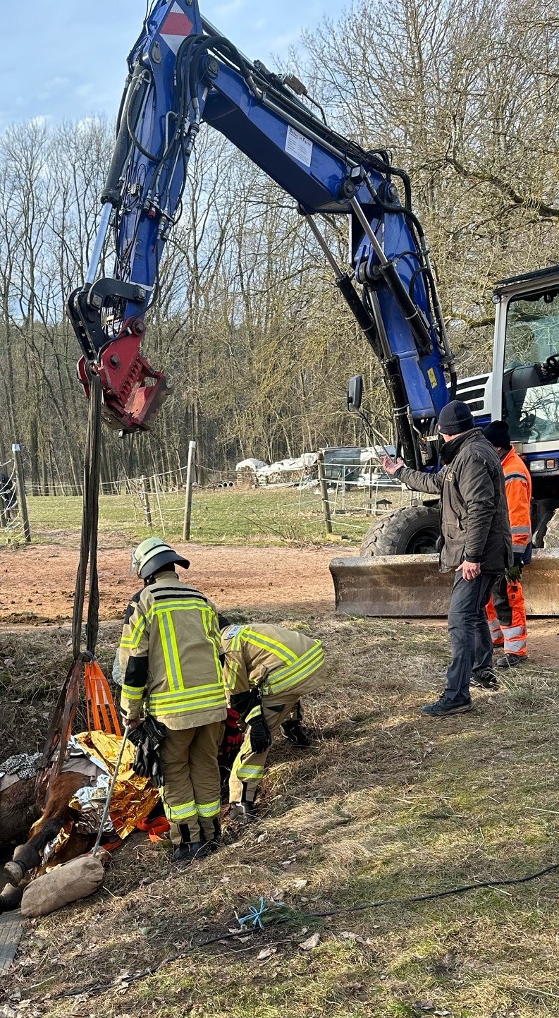 Großtierrettungseinsätze bergen erhebliche Gefahren für Helfer und Tier. Eine spezielle Ausrüstung und umfangreiche Schulungen der Einsatzkräfte sind für eine maximale Risikominimierung unerlässlich. Erst durch diese Voraussetzungen kann eine optimale Großtierrettung durchgeführt werden. Dabei spielt das Zusammenspiel aus medizinischer Komponente (Tierarzt) und technischer Komponente (Feuerwehrkräfte) eine bedeutende Rolle. Eine zwingende Grundlage für eine Rettung ist die Sedierung (leichte Narkose) des Tieres. Nur so kann das Verletzungsrisiko für die eingesetzten Helfer, aber auch das Tier selbst, reduziert werden. Zur Rettung kommen zwei Techniken in Frage. Die risikoärmere Schleiftechnik oder wenn es die Umstände nicht anders zulassen, die komplexere Rettung mittels Hebetechnik. Die Hebetechnik wird nur angewendet, wenn keine Alternativen möglich sind. Hier kommt auch zusätzlich schweres Gerät zum Einsatz. In diesem Fall wurde als Hebegerät ein Bagger mit speziellem Tierrettungsgeschirr eingesetzt der das verletzte Tier aus dem Graben hob.