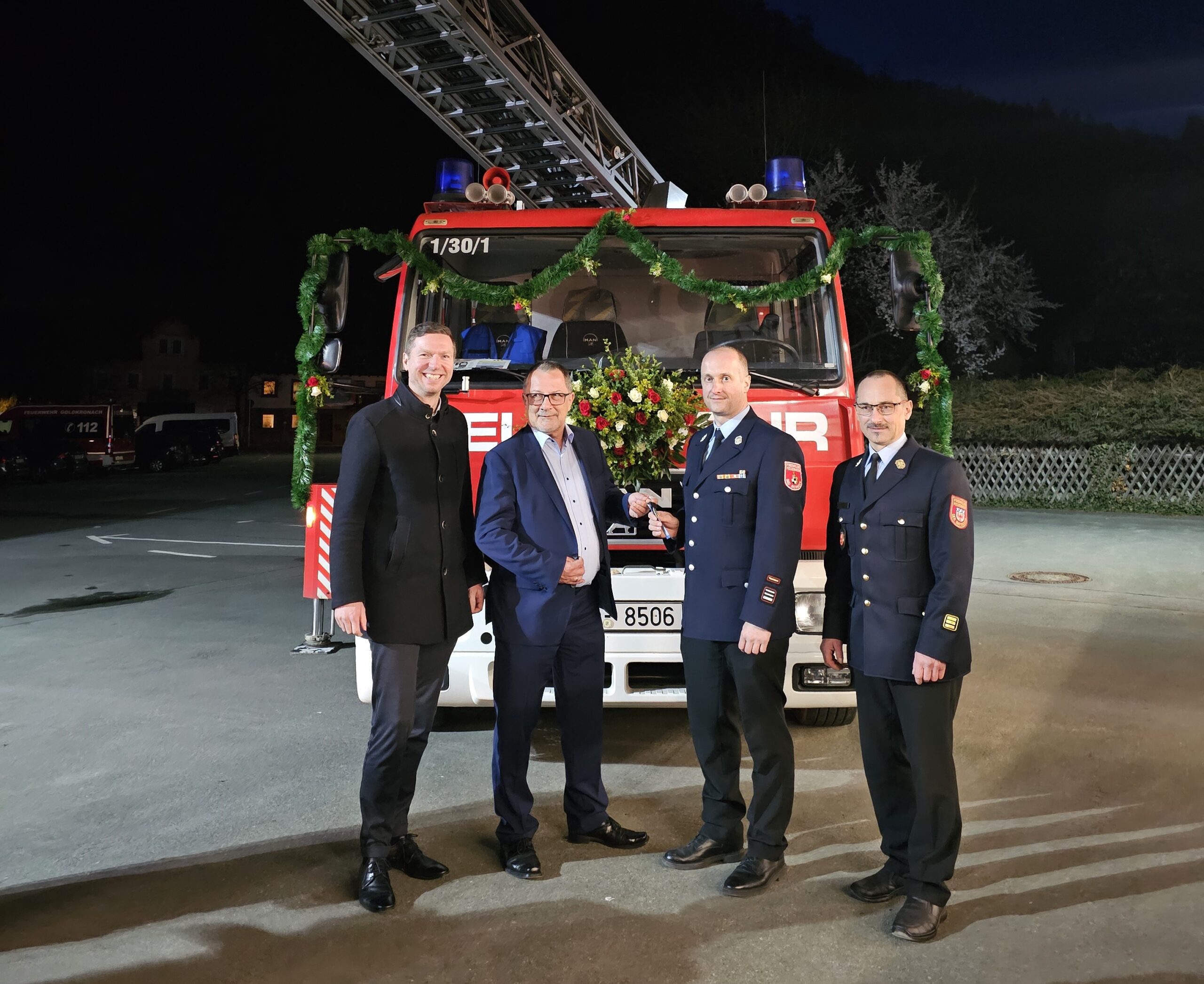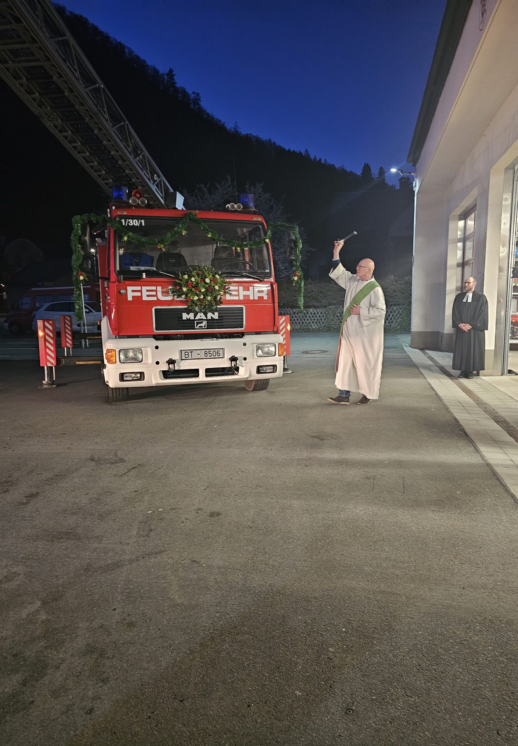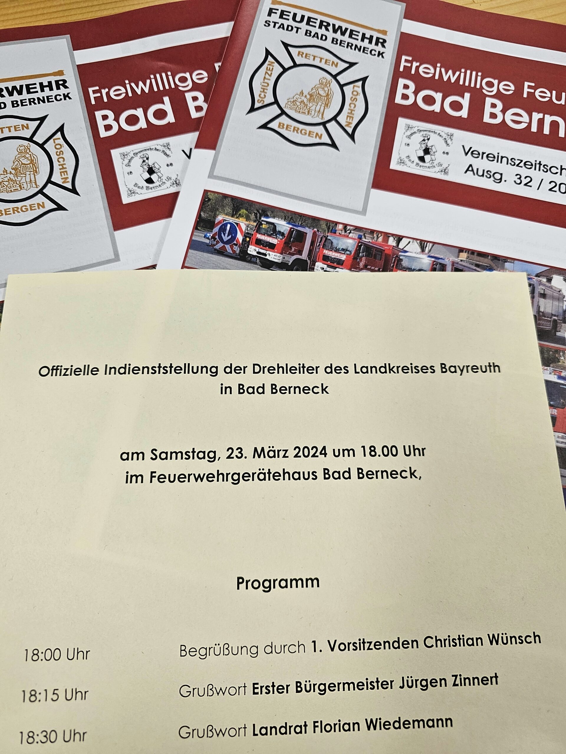 Mit der Indienststellung der Landkreis – Drehleiter am Standort der Feuerwehr Bad Berneck verfügen die Feuerwehren im Landkreis Bayreuth nunmehr über insgesamt 6 Drehleiterstandorte. Die Drehleiter stand nach der Ersatzbeschaffung in Gefrees zur Verfügung. Ein einstimmiger Stadtratsbeschluss ebnete den Weg für den neuen Standort. Die Stadt Bad Berneck verfügt über 38 Gebäude welche eine Höhe von mindestens acht bis 19 Meter vorweisen. Hier künftig zur Menschenrettung eine Drehleier in Stellung bringen zu können beruhigt den Bürgermeister und seinen Stadtrat sehr. Die sehr enge Bebauung am mittelalterlichen Markt und eine sehr zügige Brandbekämpfung von oben trug ebenfalls zu dieser Entscheidung bei. Ein weiterer wesentlicher Faktor war auch das durch die Drehleiter in Bad Berneck der gesetzlich vorgeschriebene zweite Rettungsweg, bei bestimmten Gebäuden eine Voraussetzung zur Nutzung, durch dieses Fahrzeug jetzt besteht. Für die Kameradinnen und Kameraden der Freiwilligen Feuerwehr Bad Berneck bedeutete diese Entscheidung hin zu noch mehr Sicherheit für die Bevölkerung aber auch eine deutliche Zunahme an Aus- und Fortbildungsstunden. Neben einer Grundausbildung zum Drehleitermaschinisten, welchen zehn Kameraden besuchten um die Drehleiter überhaupt zum Einsatz bringen zu können, standen intensive Stunden der Ausbildung an der Tagesordnung um sich mit dem neuen Einsatzmittel vertraut zu machen. Auch künftig wird sich der regelmäßige Übungsplan durch Übungen mit der Drehleiter erweitern. Zur feierlichen Indienststellung bei der Feuerwehr Bad Berneck kamen zahlreichen Ehrengäste wie Landrat Florian Wiedemann, der Erste Bürgermeister der Stadt Bad Berneck Jürgen Zinnert, Feuerwehrführungskräfte des Landkreises Bayreuth sowie zahlreiche Feuerwehren rund um den Standort aus dem Landkreis Bayreuth und Kulmbach. Die Fahrzeugsegnung übernahmen die Vertreter der beiden Kirchen Diakon Matthias Bischof und Pfarrer Michael Maul. Sie alle sprachen in ihren Grußworten der Stadt aber auch der Feuerwehr selbst ihren großen Respekt aus sich der Entscheidung für einen Standort in Bad Berneck angenommen zu haben und wünschen den Kameradinnen und Kameraden neben möglichst wenigen Einsätzen immer eine unfallfreie Rückkehr an ihren Standort. Dabei betonten sie ausdrücklich, dass sich das neue Einsatzmittel und die damit verbunden Entscheidungen für die Zukunft aber auch die intensiven Übungen bereits dann bezahlt gemacht haben, wenn die Drehleiter das erste Mal ein Menschenleben gerettet hat.