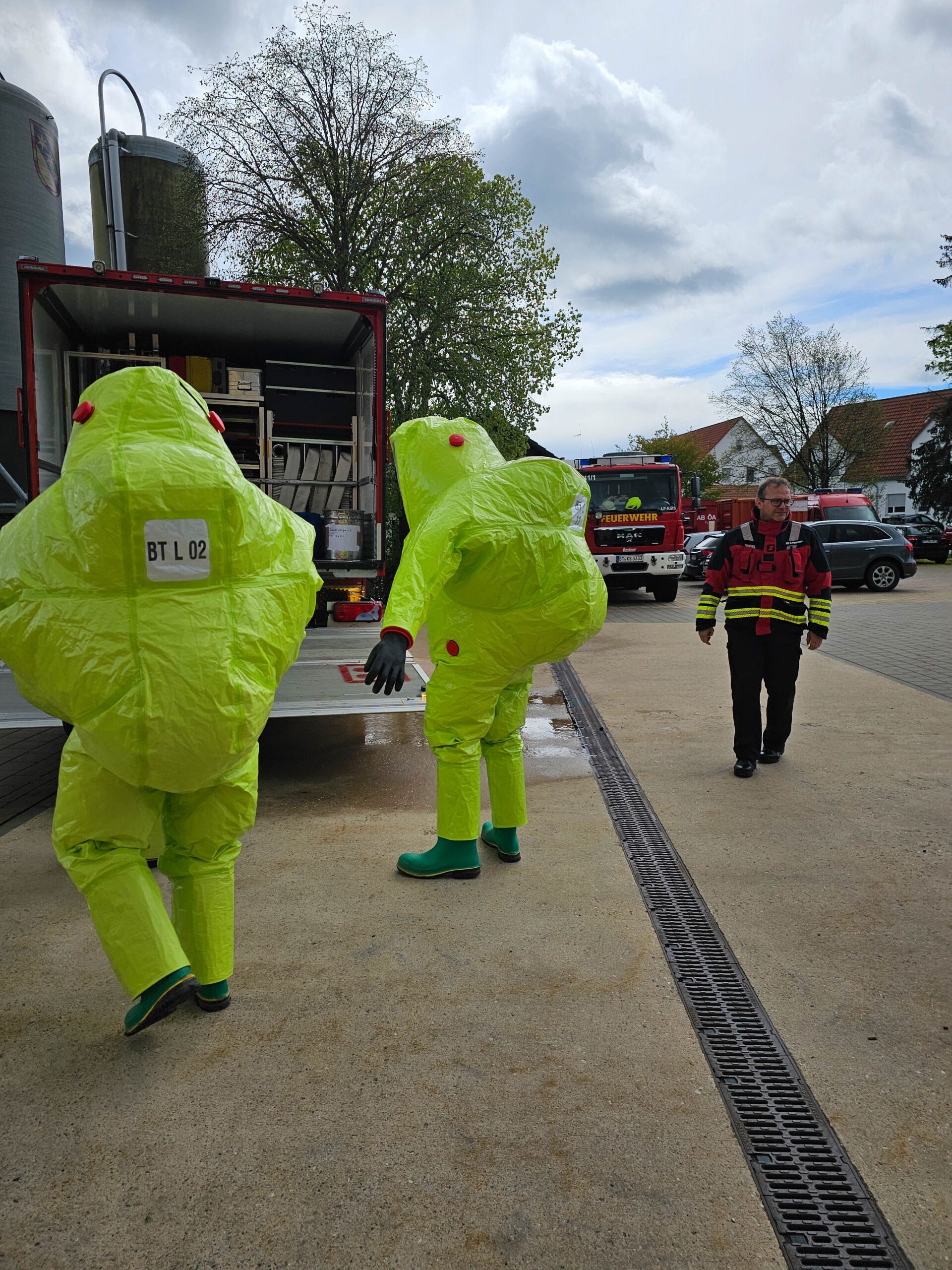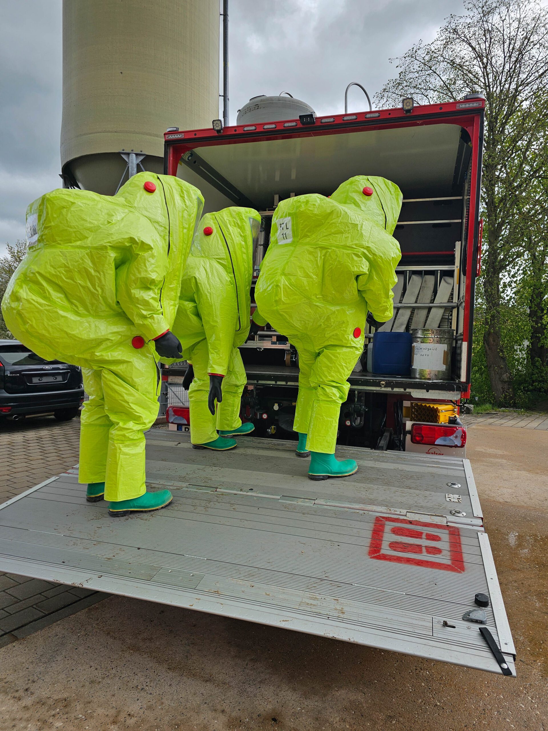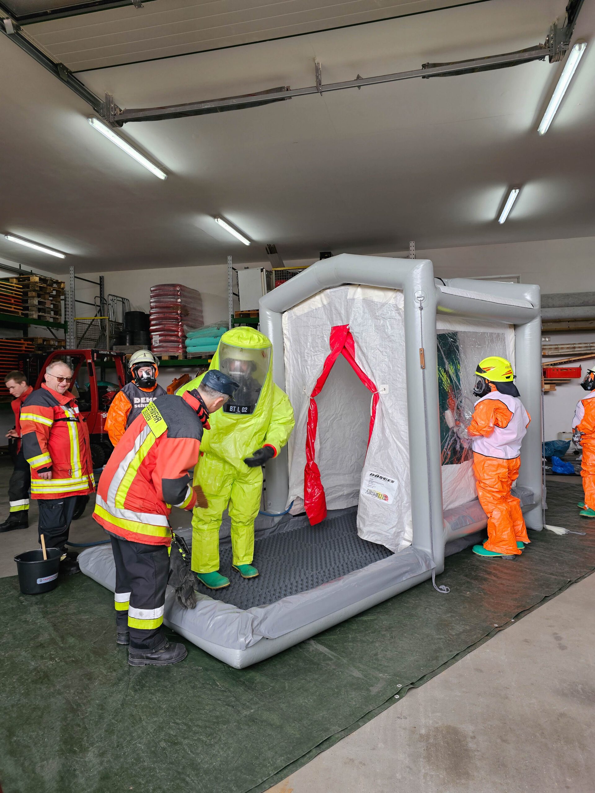 „Dekontaminieren und Auskleiden“. Sie alle sind bereits ausgebildete Atemschutzgeräteträger, welche sich jetzt der Zusatzausbildung dem Tragen von Chemieschutzanzügen (CSA) als weitere Herausforderung stellten.