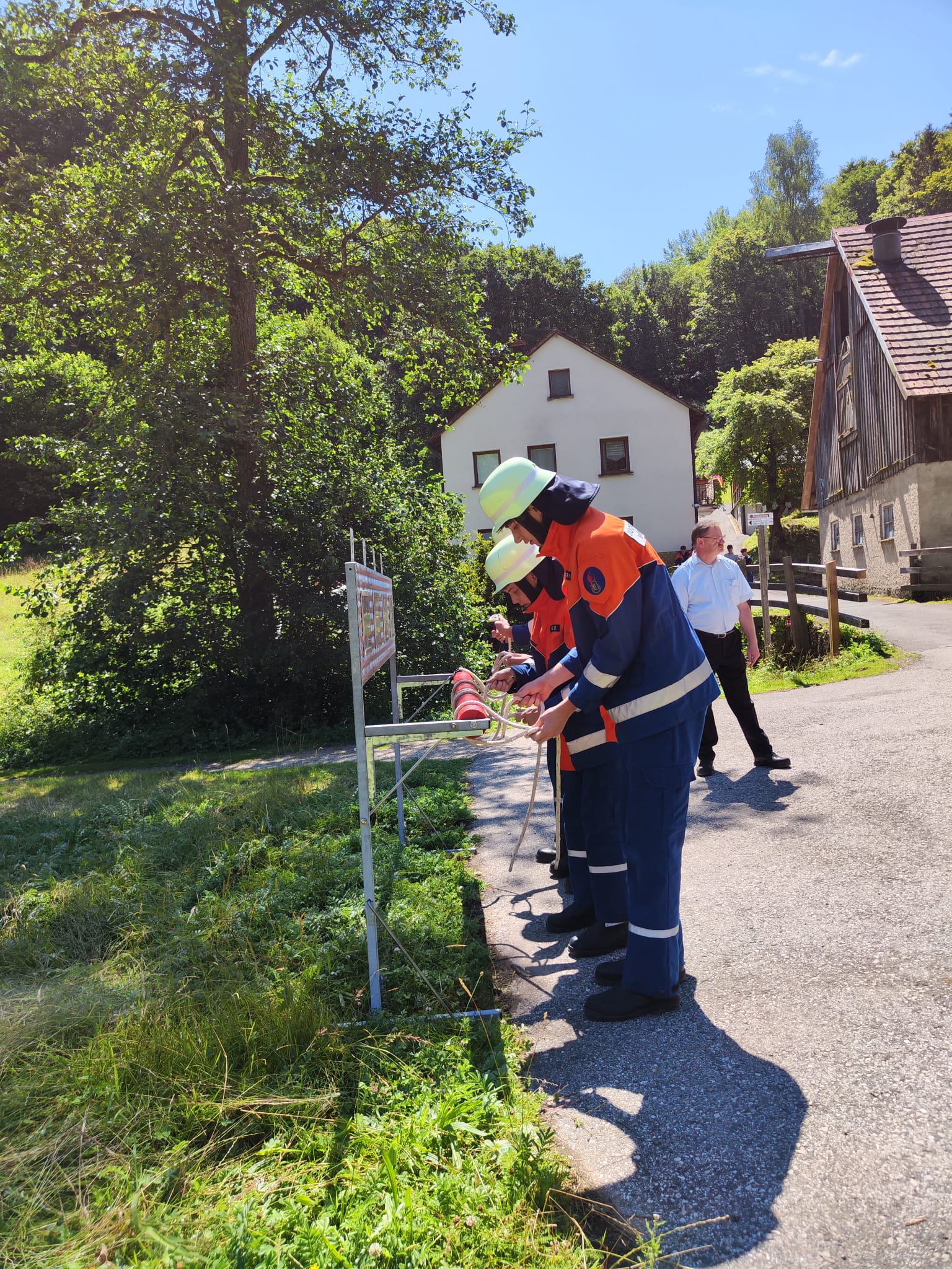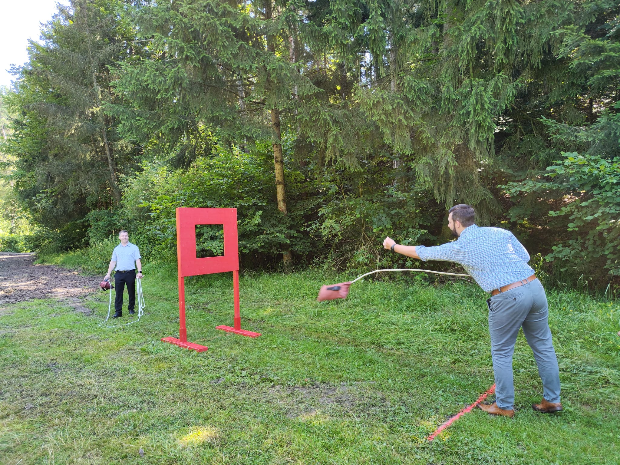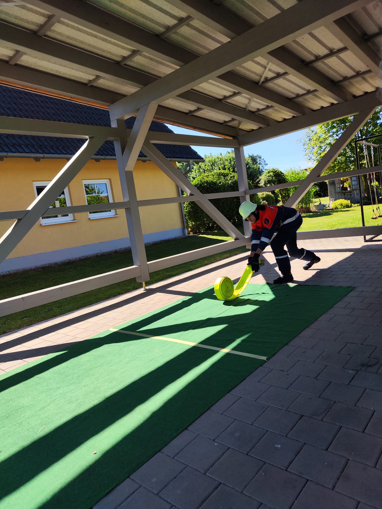 Zwischendrin, außerhalb der eigentlichen Wertung, hatten die Jugendlichen die Möglichkeit ihre Kommunikationsfähigkeit und ihren kameradschaftlichen Geist unter Beweis zu stellen. Kleine Holzklötze mussten mit einem C-Strahlrohr (beide Komponenten mit kleinen Haken ausgestattet) aus der Mitte heraus an einen vordefinierten Punkt abgelegt werden. Dabei war eine gute Absprache untereinander unerlässlich um eine Bestzeit zu schaffen.