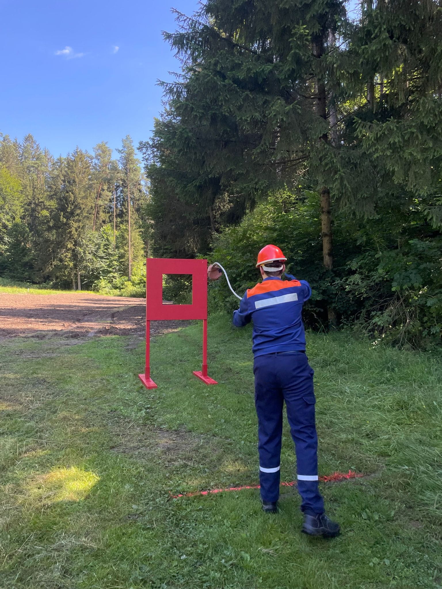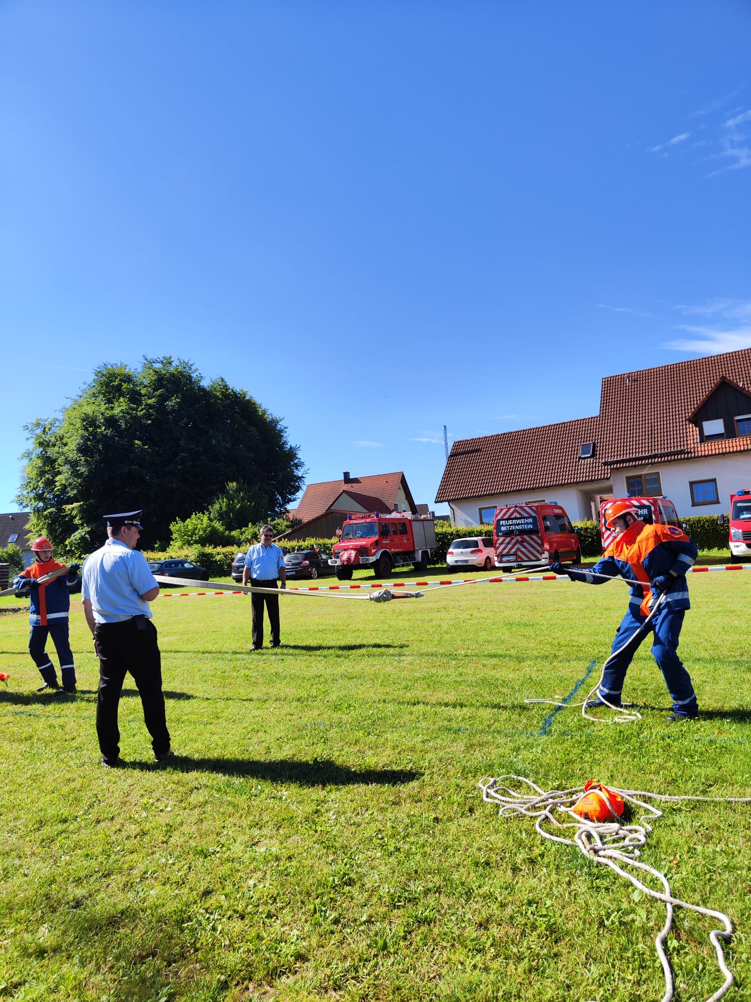 Neben der bewerteten Start- und Zielkontrolle meisterten die jungen Feuerwehranwärter folgende Stationen: CM-Strahlrohr mit C-Schlauch über einen Graben ziehen, Ausrollen eines doppelt gerollten C-Schlauch, Zuordnen von Ausrüstungsgegenständen, Kuppeln einer 60m C-Schlauchleitung, Zielwurf mit der Feuerwehrleine, Anlegen eines Brustbundes, Knotengestell mit 4 verschiedenen Knoten, Anlegen eines Mastwurfes und Testfragen. Das Auftreten der jeweiligen Jugendgruppen an den Stationen welche rund um das Schloss Kühlenfels und seiner malerischen Umgebung aufgebaut waren fiel ebenfalls mit in die Bewertung.