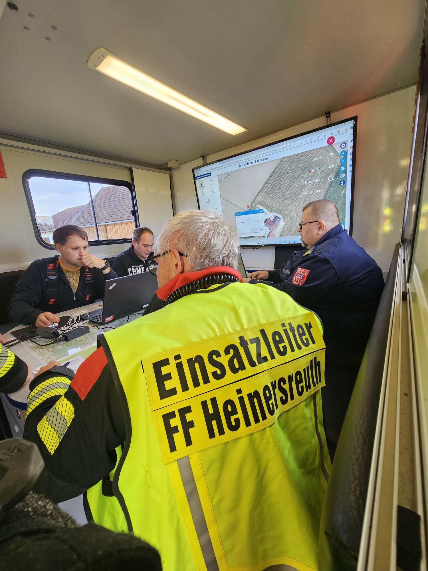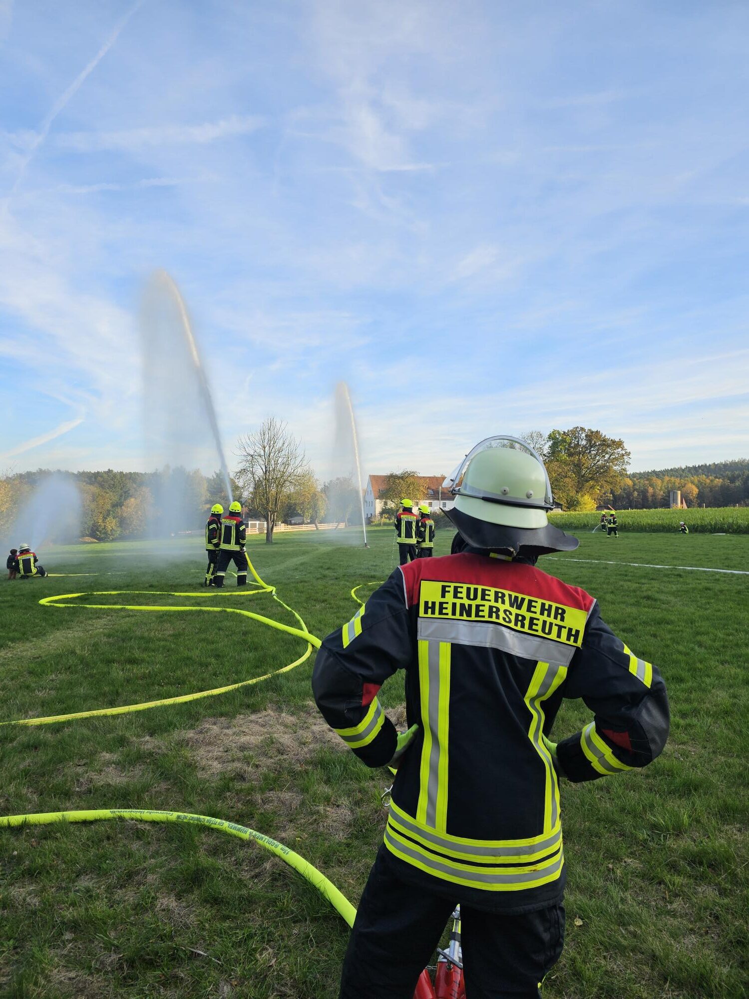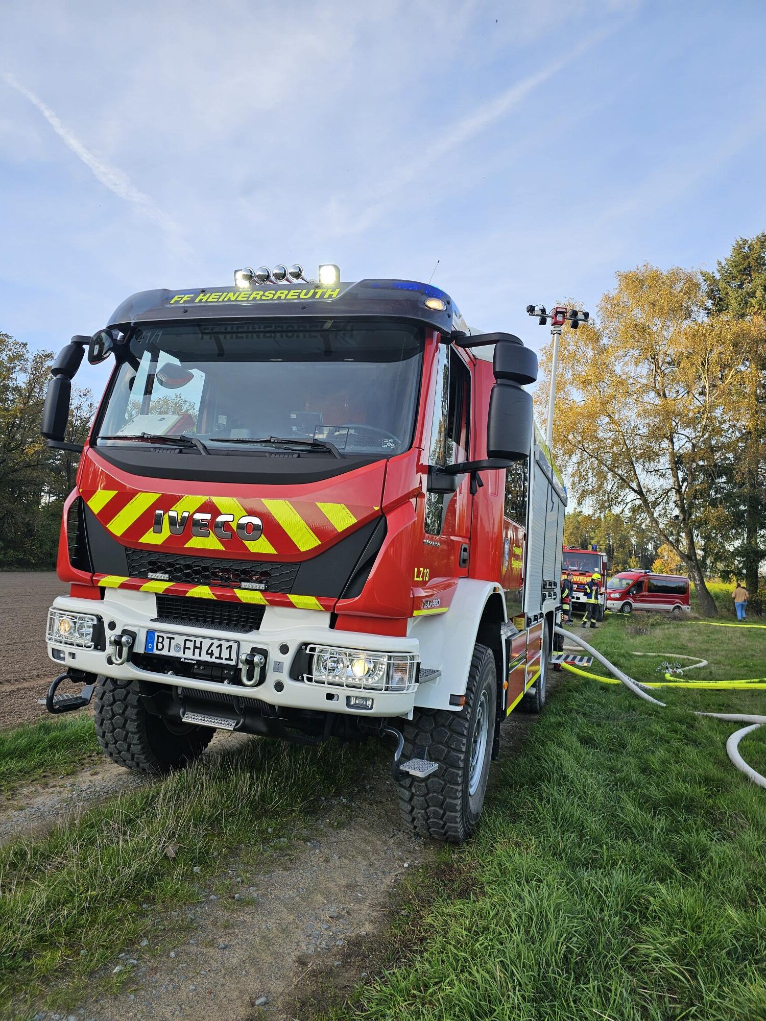 Ein anfänglich kleiner Brand auf einem Spielplatz dehnte sich rasch zu einem ausgedehnten Waldbrand aus. Feuerwehren aus drei Gebietskörperschaften wurden daraufhin in den Gemeindebereich Heinersreuth alarmiert. 4 Hektar Wald standen bei Eintreffen der nachalarmierten Feuerwehreinsatzkräfte aus dem Landkreis Bayreuth, der Stadt Bayreuth und dem Landkreis Kulmbach am Samstag den 26. Oktober 2024 größten teils in Flammen. Was durchaus ein Ernstfall sein könnte war eine großangelegte Übung der Freiwilligen Feuerwehr Heinersreuth am Samstag den 26. Oktober. Für die Zukunft gut aufgestellt zu sein und Handlungsabläufe zu üben um festzustellen wo für den tatsächlichen Ernstfall noch Handlungsbedarf besteht sind die Ziele solch groß angelegter Übungen. Wie sich herauskristallisierte funktionierte die Zusammenarbeit zwischen der Feuerwehren aus den drei Gebietskörperschaften und den Landwirten hervorragend.