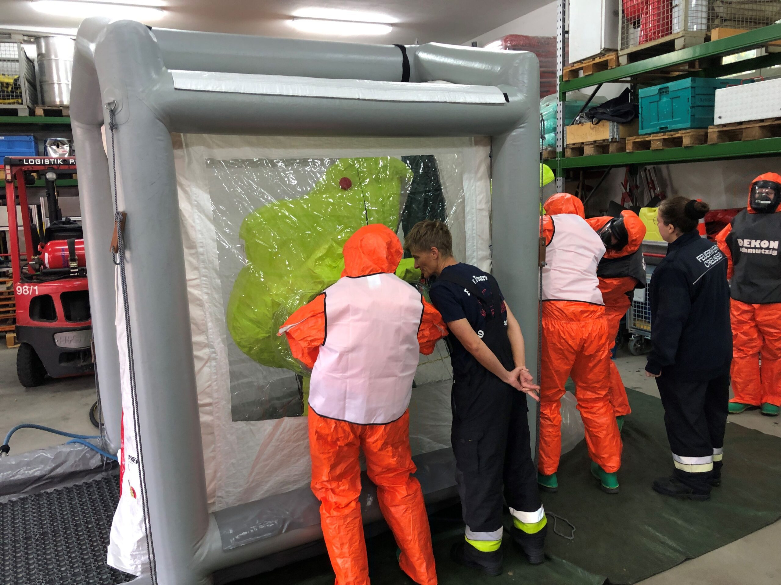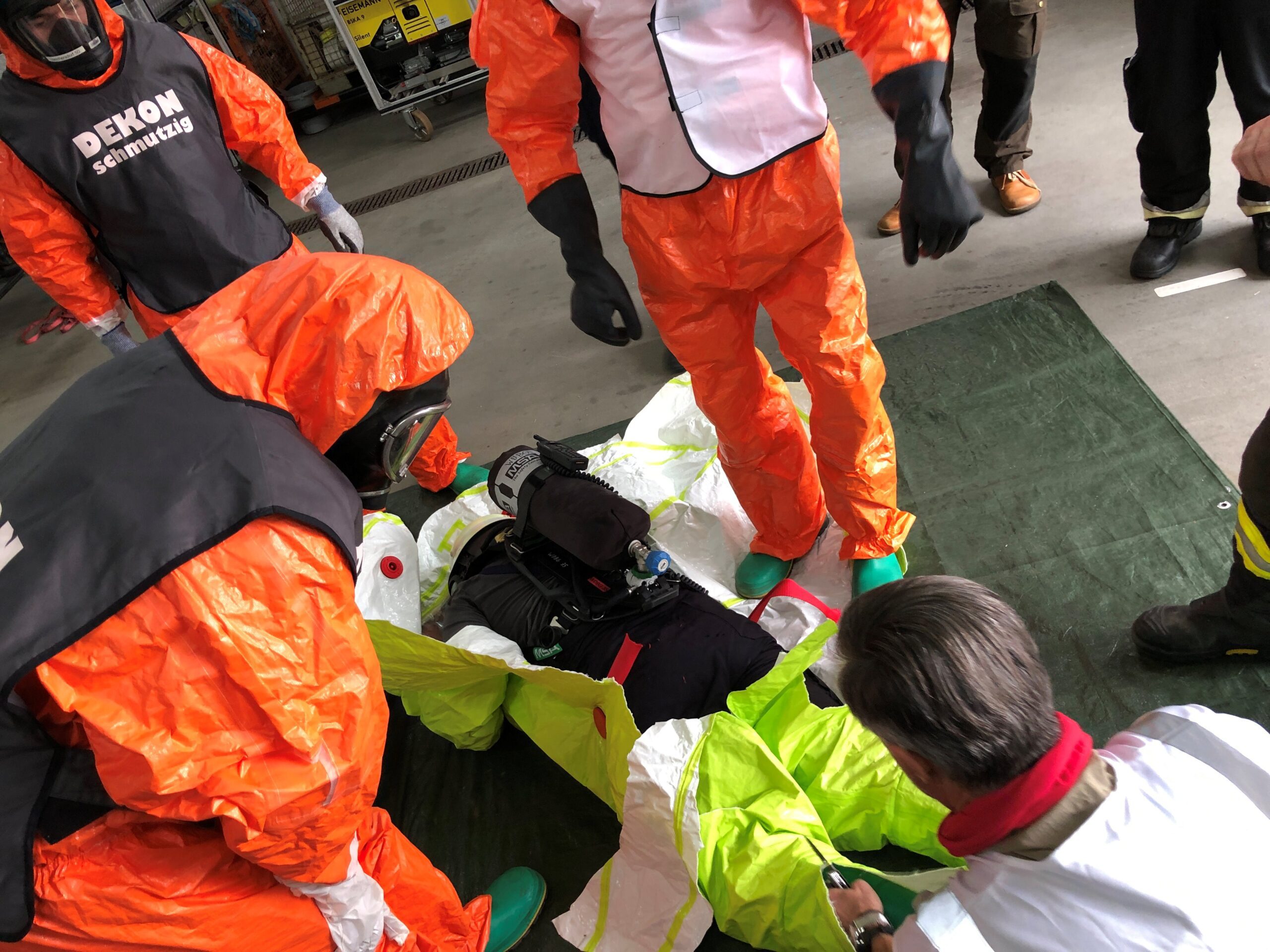 Am 19.10.2024 wurde der Lehrgang um 08:00 Uhr mit dem praktischen Teil fortgeführt. Die Teilnehmer durchliefen die Stationen „Ankleiden“, „Belastungsübung“, „Einsatzübung“ mit Erkundung & Auswertung und dem anschließenden „Dekontaminieren und Auskleiden“.