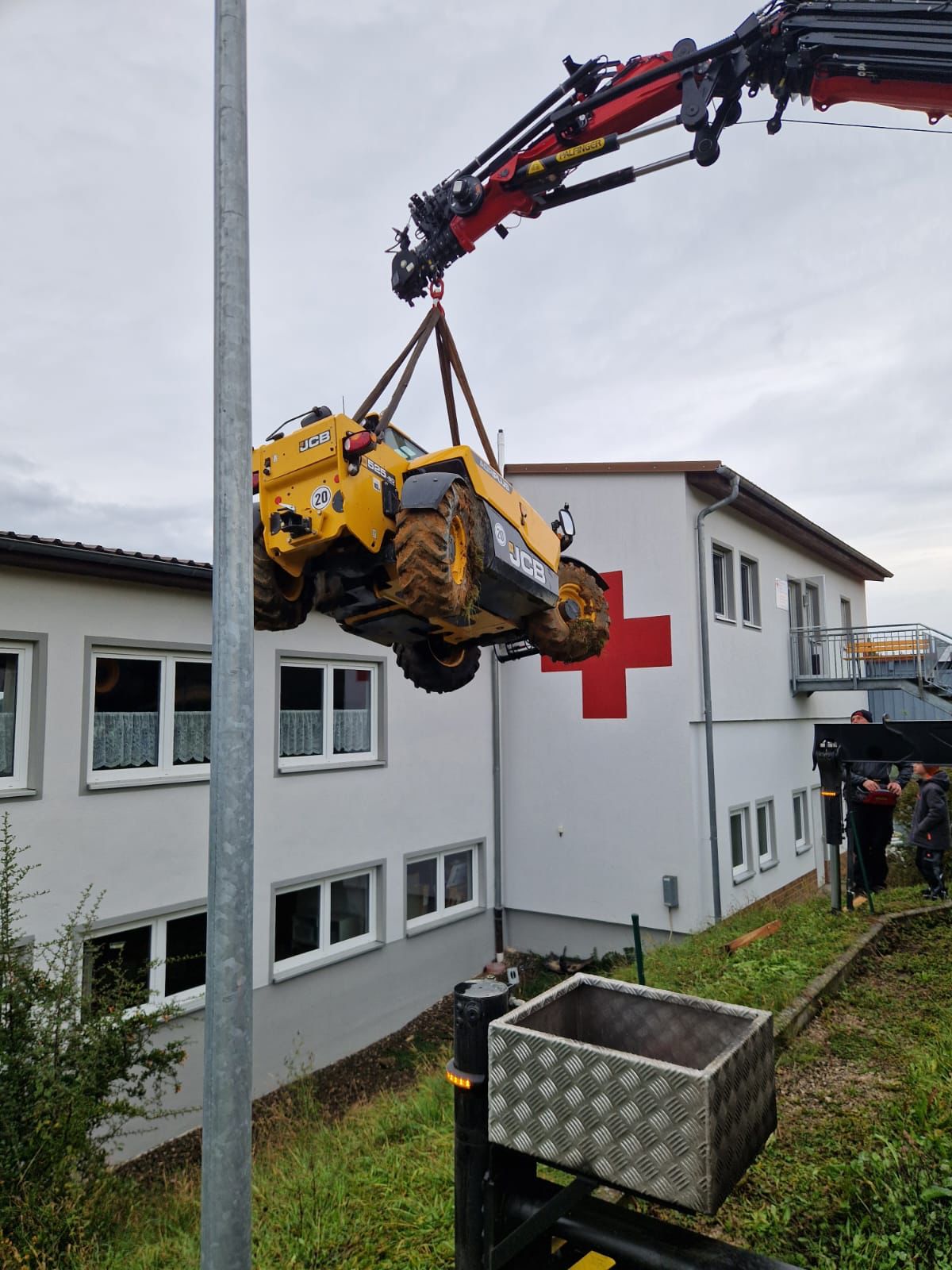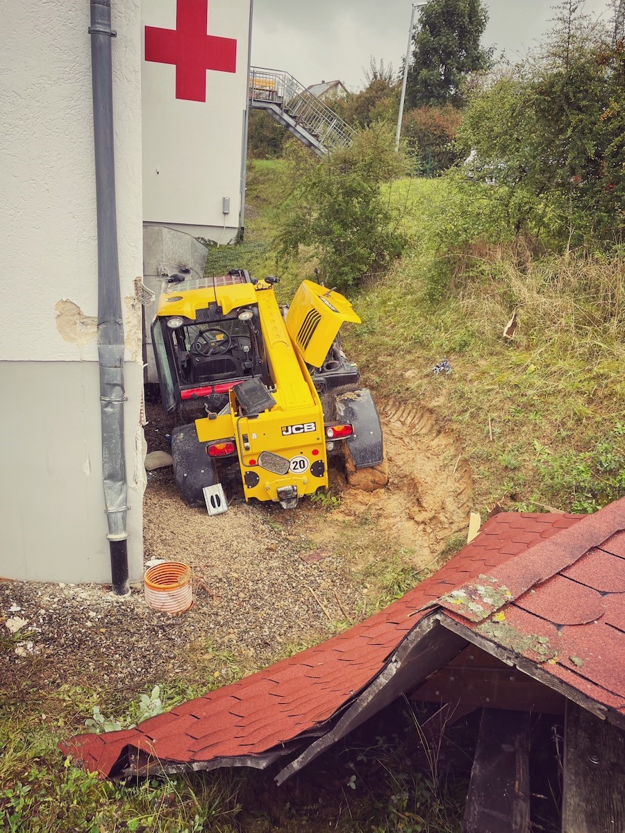 Am Freitagnachmittag (04.10.2024) ereignete sich in Hollfeld ein Verkehrsunfall mit einem Teleskoplader. Aus bislang unklaren Gründen verlor der Fahrzeugführer die Kontrolle über die Baumaschine, kam von der Straße ab, durchfuhr einen Zaun und eine Holzkonstruktion und rutschte anschließend einen Abhang hinunter, bevor er an einem Gebäude zum Stehen kam. Die hierzu alarmierten Feuerwehren aus Hollfeld, Weiher und Waischenfeld befreiten den Fahrer und retten ihn per Schaufeltrage, um ihn dem Rettungsdienst zur weiteren Behandlung zu übergeben. Die Unfallstelle wurde während der Rettungsarbeiten abgesperrt. Bei diesem Einsatz waren rund 35 Feuerwehreinsatzkräfte gebunden. Am Folgetag konnte der Teleskoplader selbst geborgen werden.