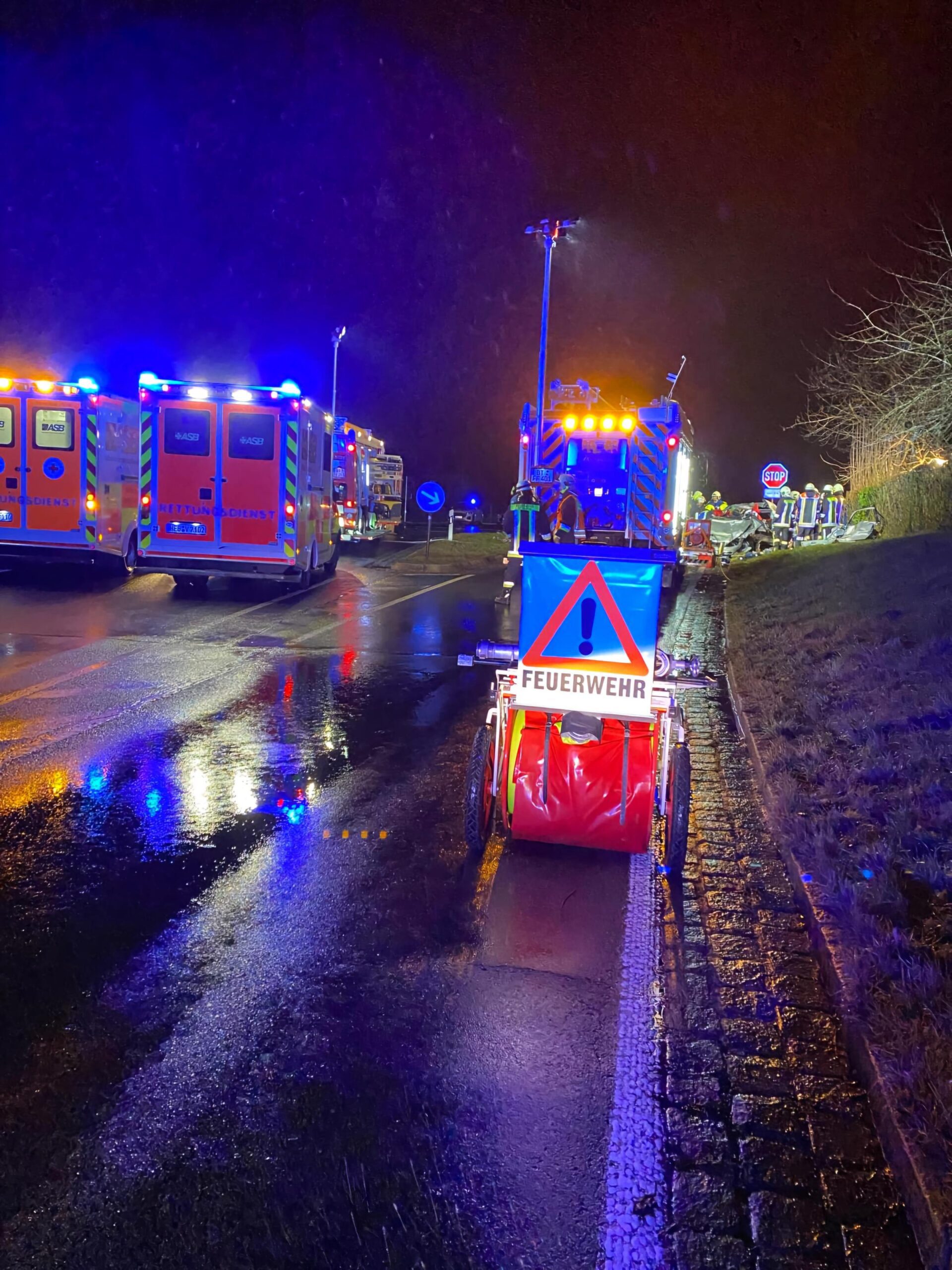 Fast zeitgleich ereignete sich ein weiterer Verkehrsunfall bei Kleinkirchenbirkig. Dort war ein Fahrzeug aus noch ungeklärter Ursache von der Fahrbahn abgekommen und im angrenzenden Wald zum Stehen gekommen. Der Fahrzeugführer stand unter Schock und wurde von der alarmierten Freiwilligen Feuerwehr Kühlenfels bis zum Eintreffen des Rettungsdienstes versorgt. Die Feuerwehreinsatzkräfte beseitigte einzelne, kleinere Fahrzeugteile von der Fahrbahn und regelten den Verkehr. Um 19 Uhr konnte die Feuerwehr Kühlenfels die Einsatzstelle ebenfalls an die Polizei übergeben und wieder zurück an ihren Standort kehren.