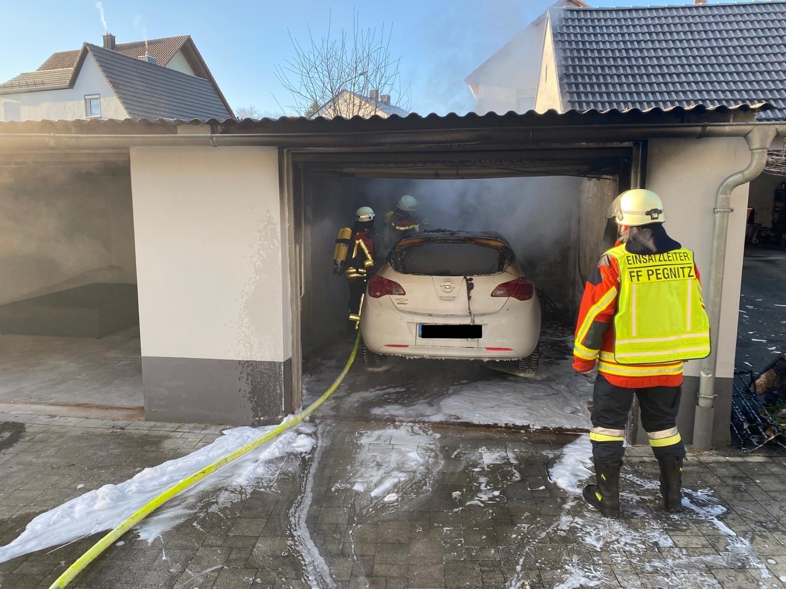 Parallel zur Versorgung des Verletzten durch den Rettungsdienst übernahm die Freiwillige Feuerwehr Pegnitz die Brandbekämpfung unter Atemschutz des brennenden Fahrzeuges in der Garage. Die Freiwillige Feuerwehr Kirchenbirkig führte Verkehrssicherungsmaßnahmen aus während von der Feuerwehr Hainbronn zur Unterstützung der eingesetzten Kräfte aus Pegnitz ein weiterer Rettungstrupp bereitgestellt wurde.