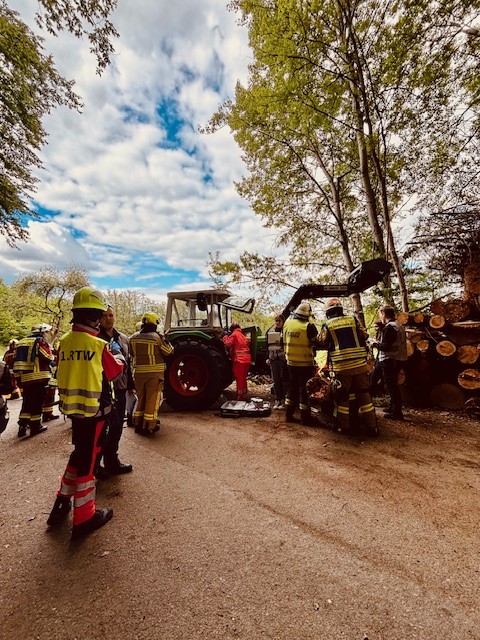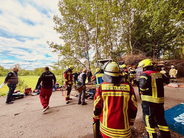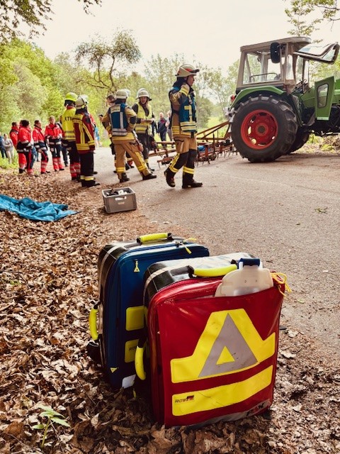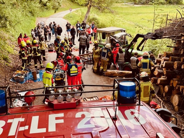 Am Nachmittag ging es in den Praxisteil: Die Einsatzkräfte konnten verschiedene Rettungsgeräte von Feuerwehr und Rettungsdienst nicht nur kennenlernen, sondern auch direkt ausprobieren. Anschließend folgten zwei realitätsnahe Einsatzübungen. Zunächst wurde ein Verkehrsunfall mit sieben Verletzten und drei beteiligten Fahrzeugen simuliert. Danach mussten die Teams zu einem Unfall mit landwirtschaftlichem Gerät ausrücken, bei dem ebenfalls mehrere Verletzte von Feuerwehr und Rettungsdienst gerettet und versorgt werden mussten.