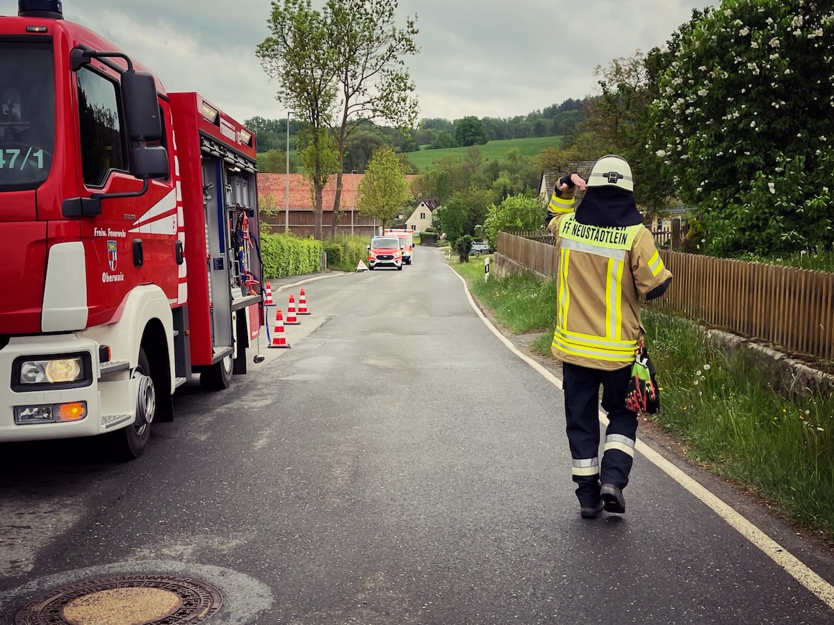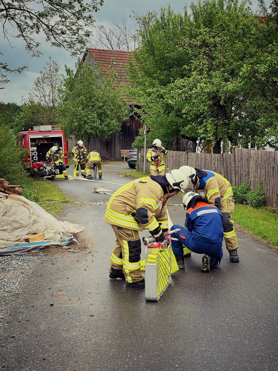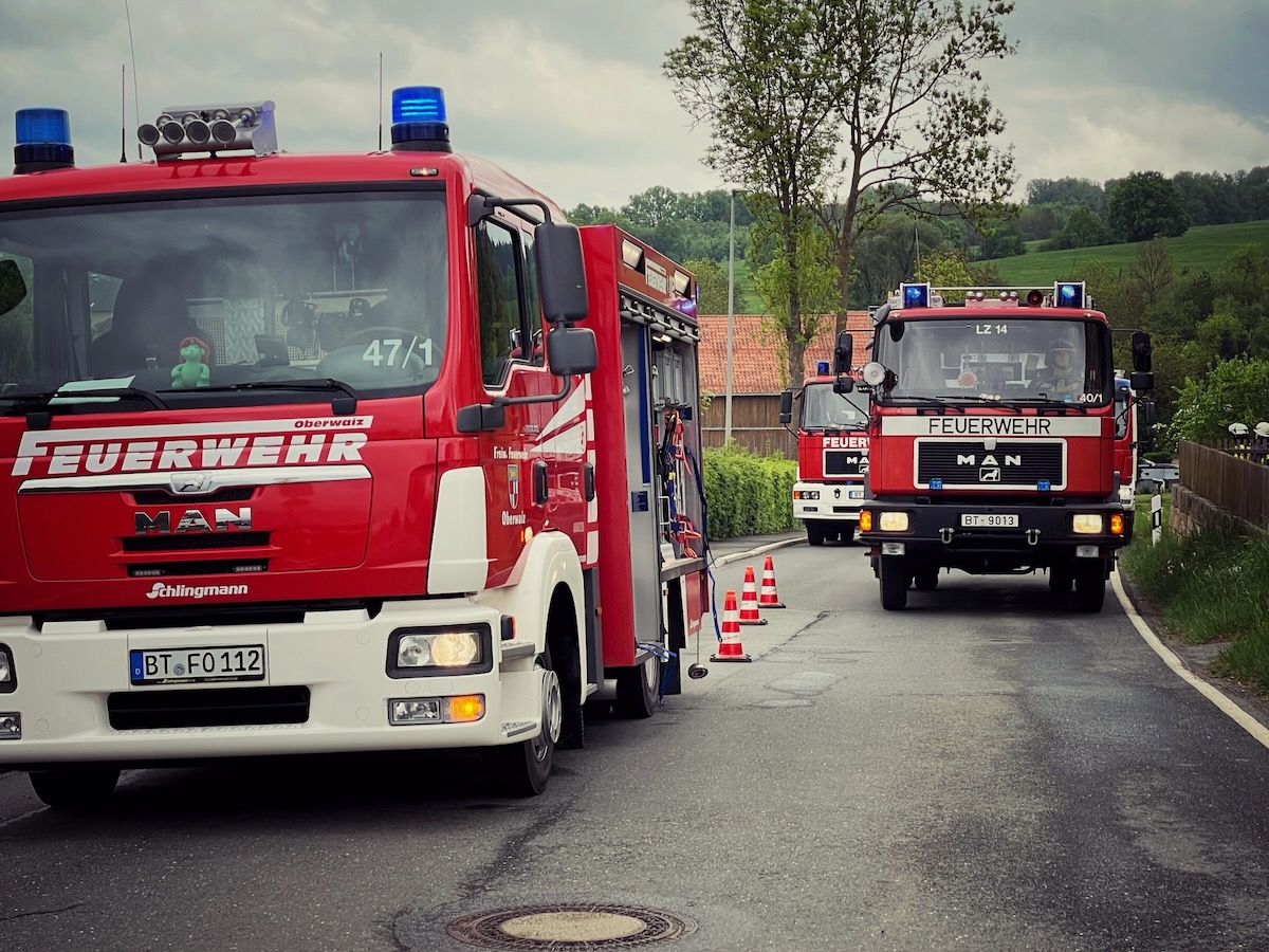 60 Einsatzkräfte trainierten am Samstagnachmittag (3. Mai 2025) in Neustädtlein (Gemeinde Eckersdorf) einen angenommenen Brand an einer Bäckerei. Das von KBM Daniel Ermer ausgearbeitete Szenario sah dabei u.a. vier vermisste Personen vor, zwei Nebelmaschinen sorgten mit künstlichem Rauch für realitätsgerechte Eindrücke.