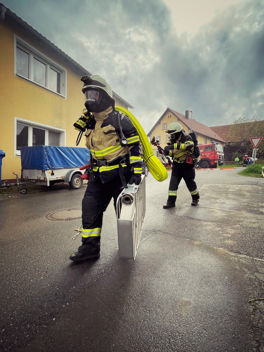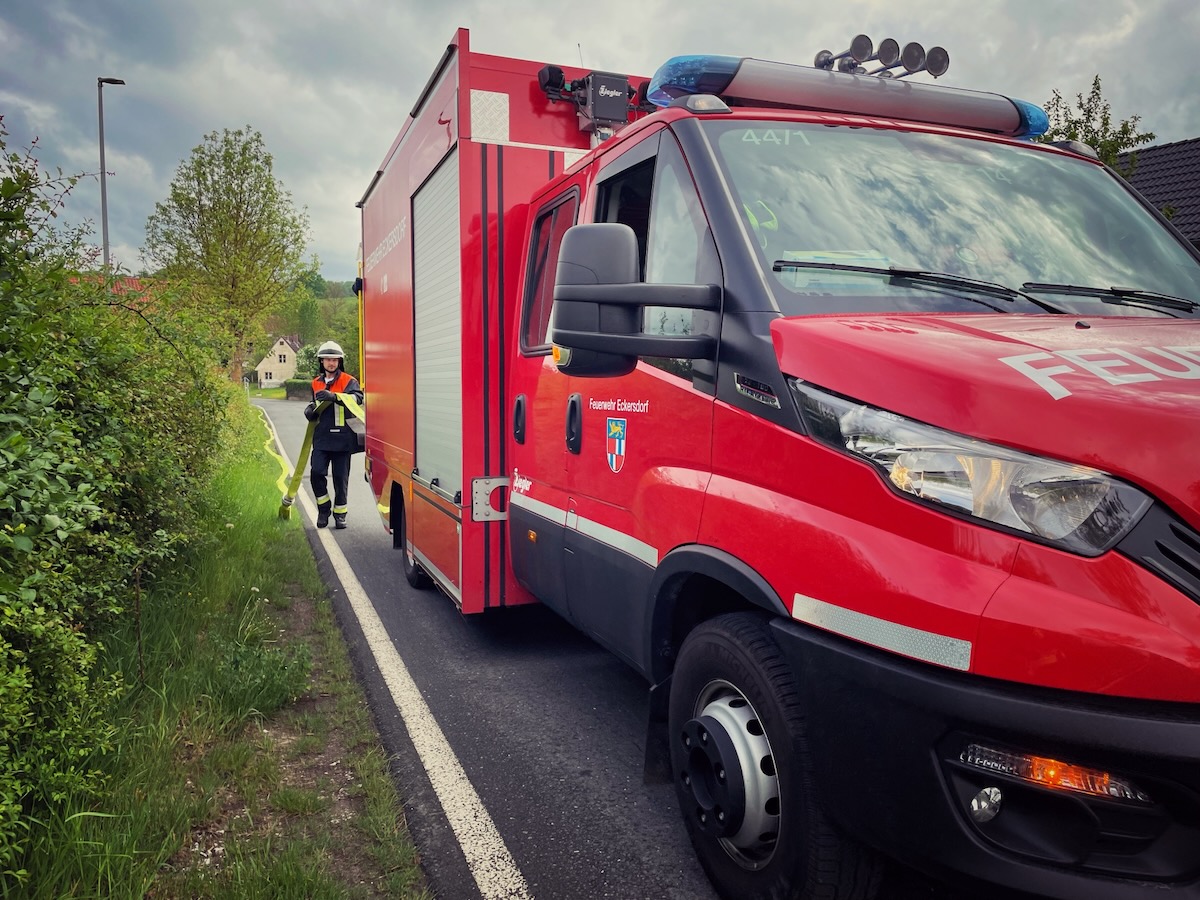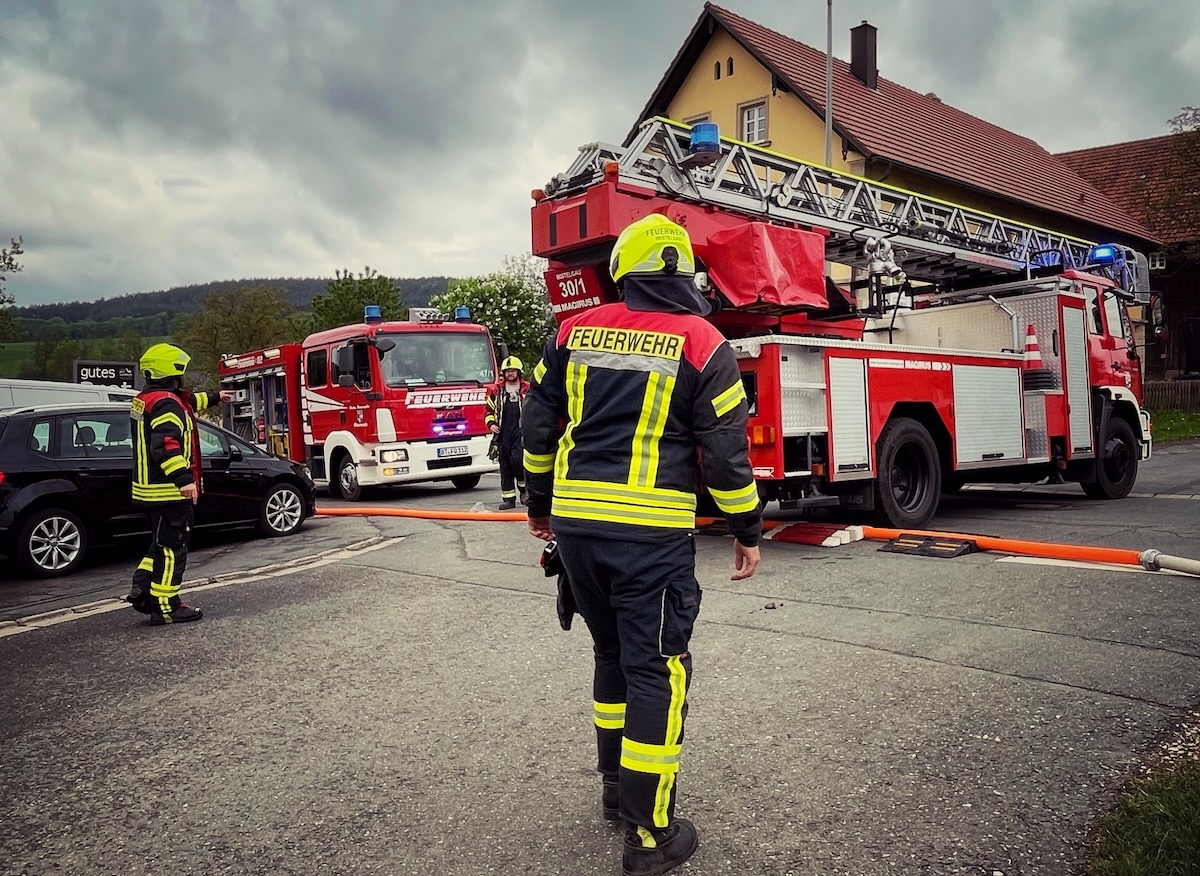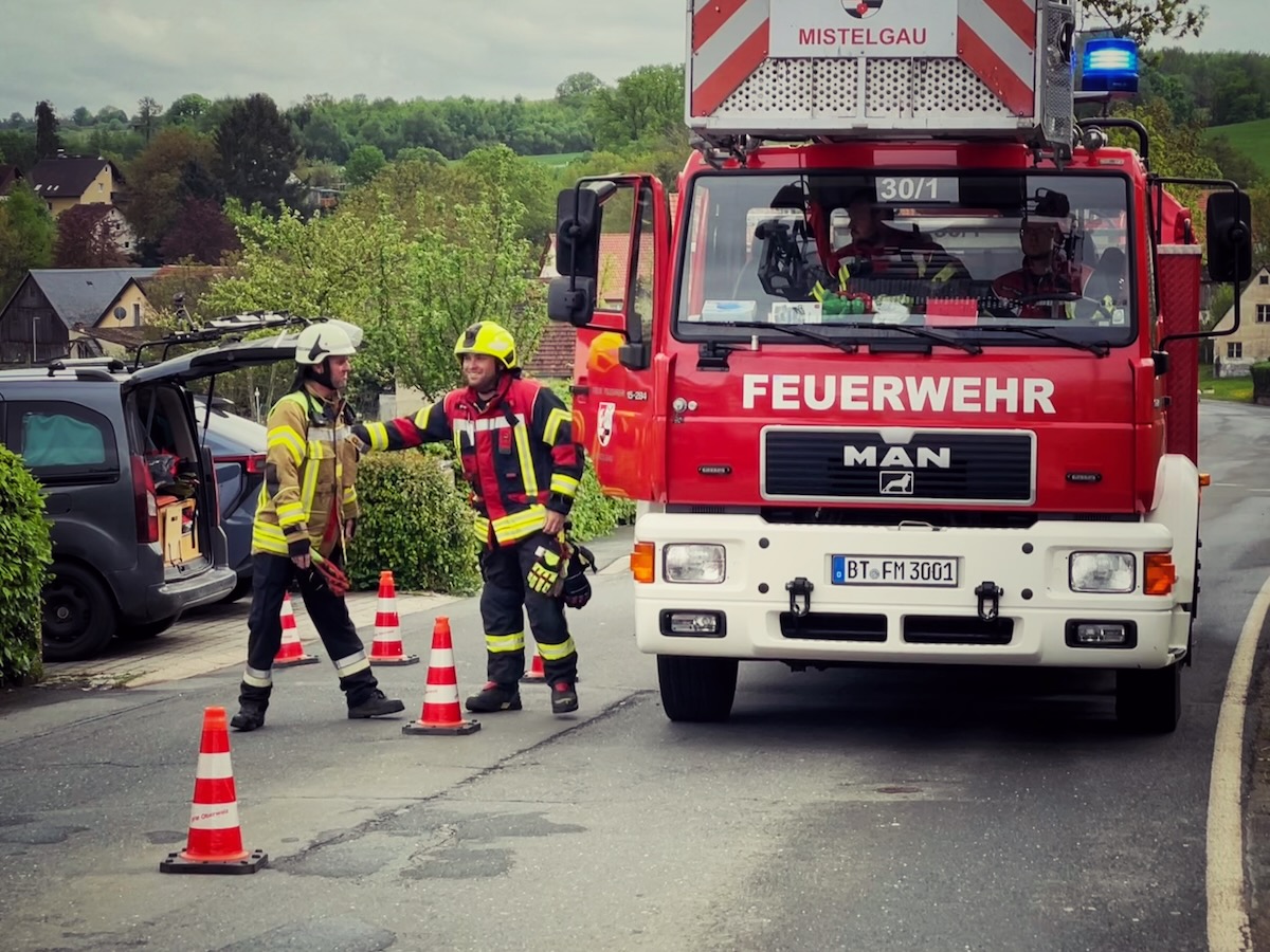 60 Einsatzkräfte trainierten am Samstagnachmittag (3. Mai 2025) in Neustädtlein (Gemeinde Eckersdorf) einen angenommenen Brand an einer Bäckerei. Das von KBM Daniel Ermer ausgearbeitete Szenario sah dabei u.a. vier vermisste Personen vor, zwei Nebelmaschinen sorgten mit künstlichem Rauch für realitätsgerechte Eindrücke.