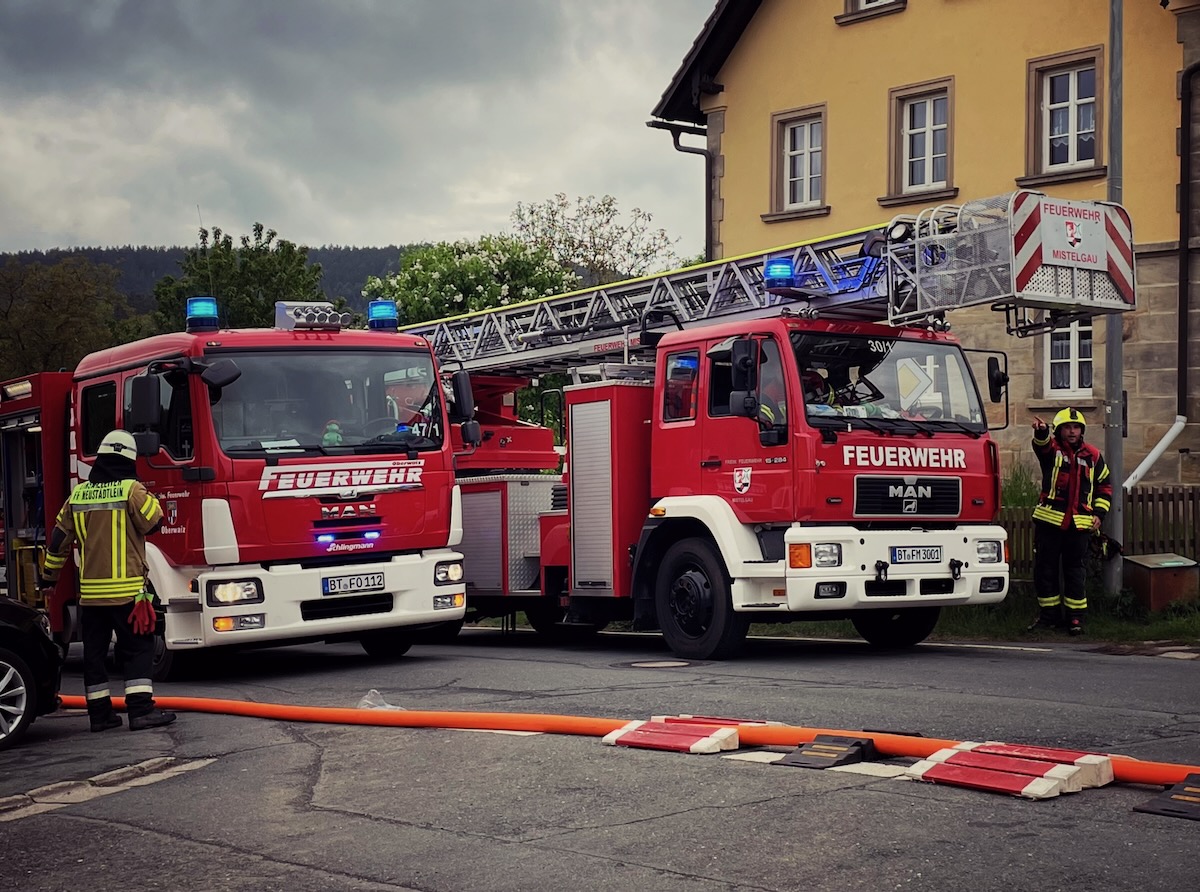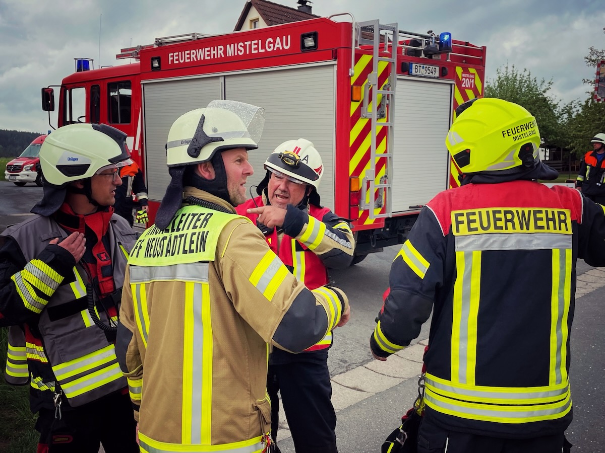 Rund eine Stunde lang beübten die Feuerwehren aus Neustädtlein, Eschen, Oberwaiz, Busbach, Donndorf, Eckersdorf und Mistelgau unter der Leitung von Kommandant Ingo Porkert die gestellten Herausforderungen, zu denen die Ordnung des Raumes, Personenrettung mittels Atemschutzgeräteträgern, Brandbekämpfung sowie die Herstellung einer belastbaren Löschwasserversorgung, insbesondere mittels langer Schlauchstrecke, gehörte. Vier Angehörige des BRK Mistelgau kümmerten sich um die medizinischen Aspekte. Eine kurze Nachbesprechung rundete die für alle Beteiligten lehrreiche Ausbildungsveranstaltung ab.