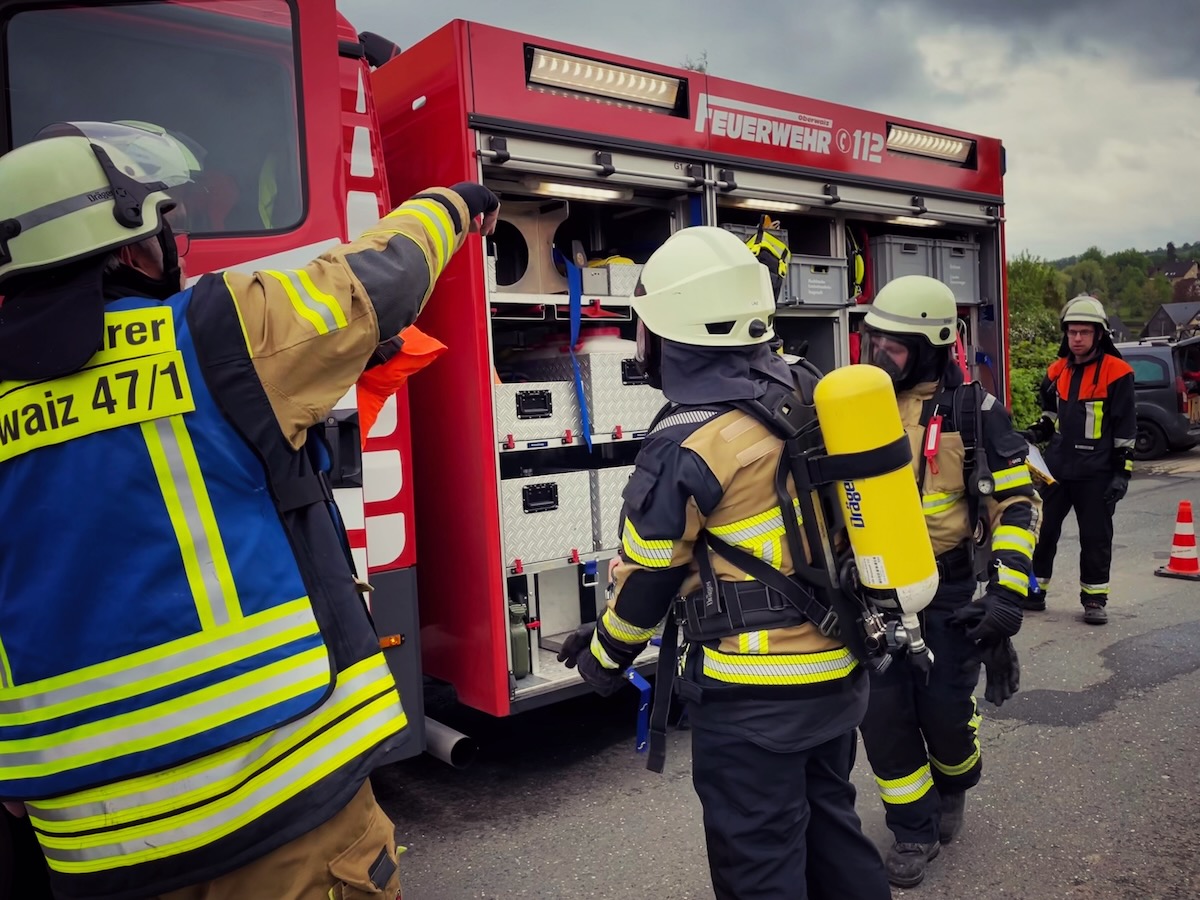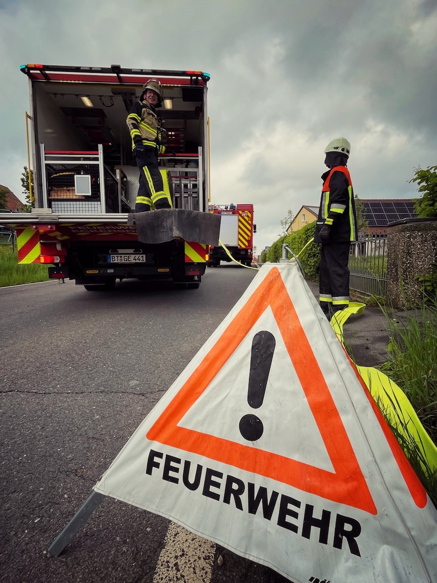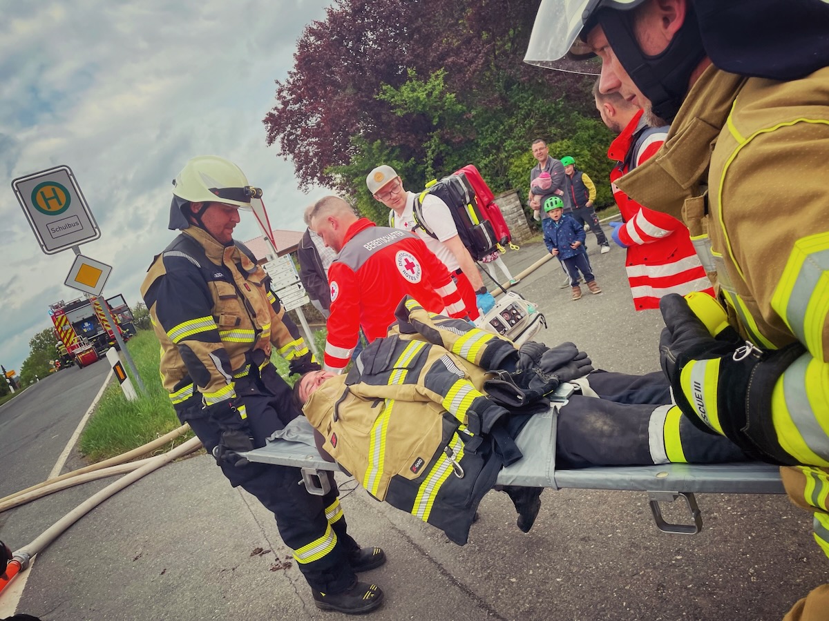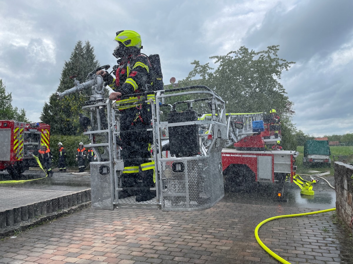 60 Einsatzkräfte trainierten am Samstagnachmittag (3. Mai 2025) in Neustädtlein (Gemeinde Eckersdorf) einen angenommenen Brand an einer Bäckerei. Das von KBM Daniel Ermer ausgearbeitete Szenario sah dabei u.a. vier vermisste Personen vor, zwei Nebelmaschinen sorgten mit künstlichem Rauch für realitätsgerechte Eindrücke.