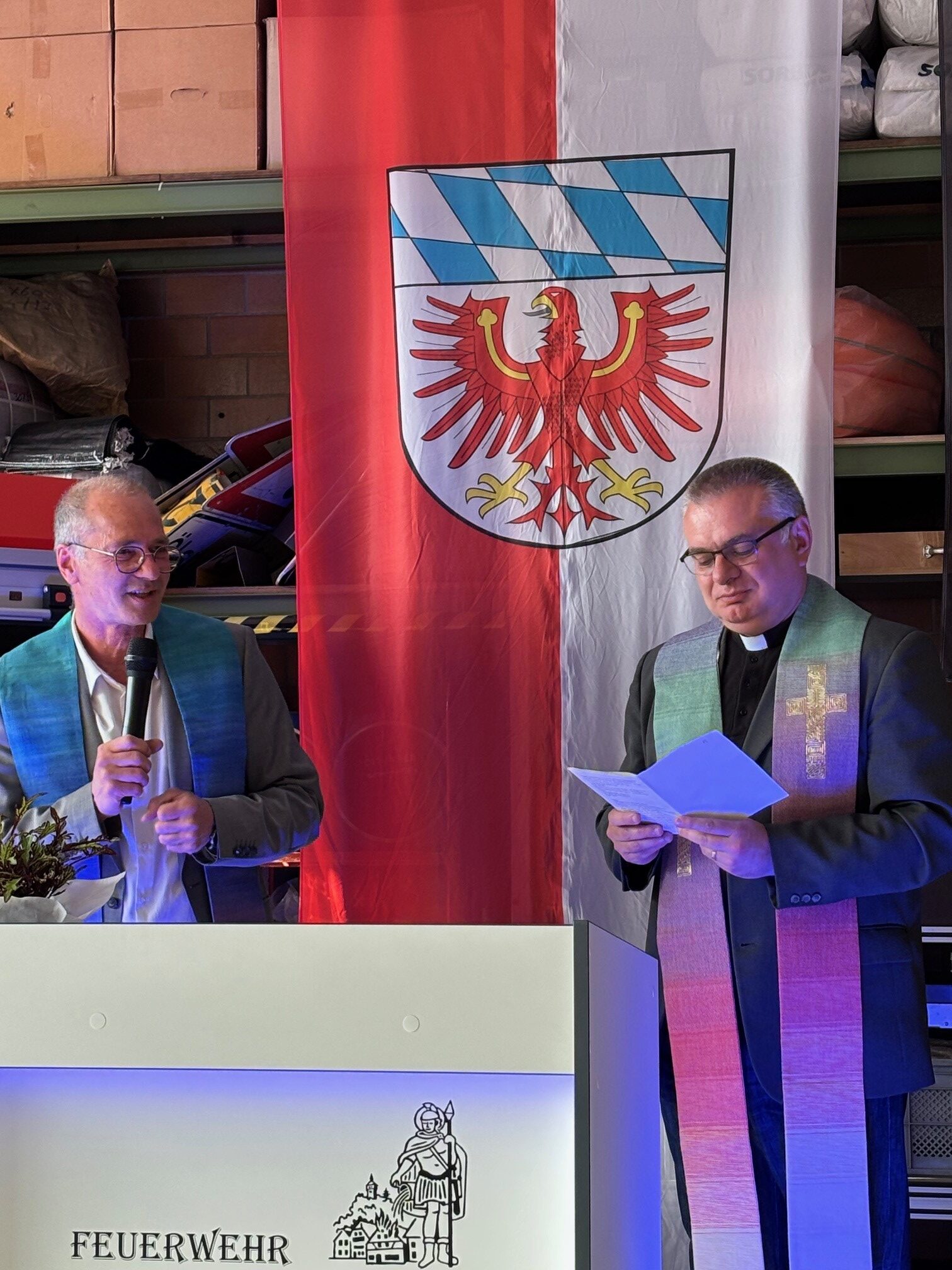 Im Rahmen der feierlichen Übergabe richteten Landrat Florian Wiedemann, Bürgermeister Jürgen Zinnert sowie Kreisbrandrat Hermann Schreck ihre Grußworte an die Gäste. Die ökumenische Segnung des Fahrzeugs erfolgte durch Pfarrer Osak und Pfarrer Taxis.