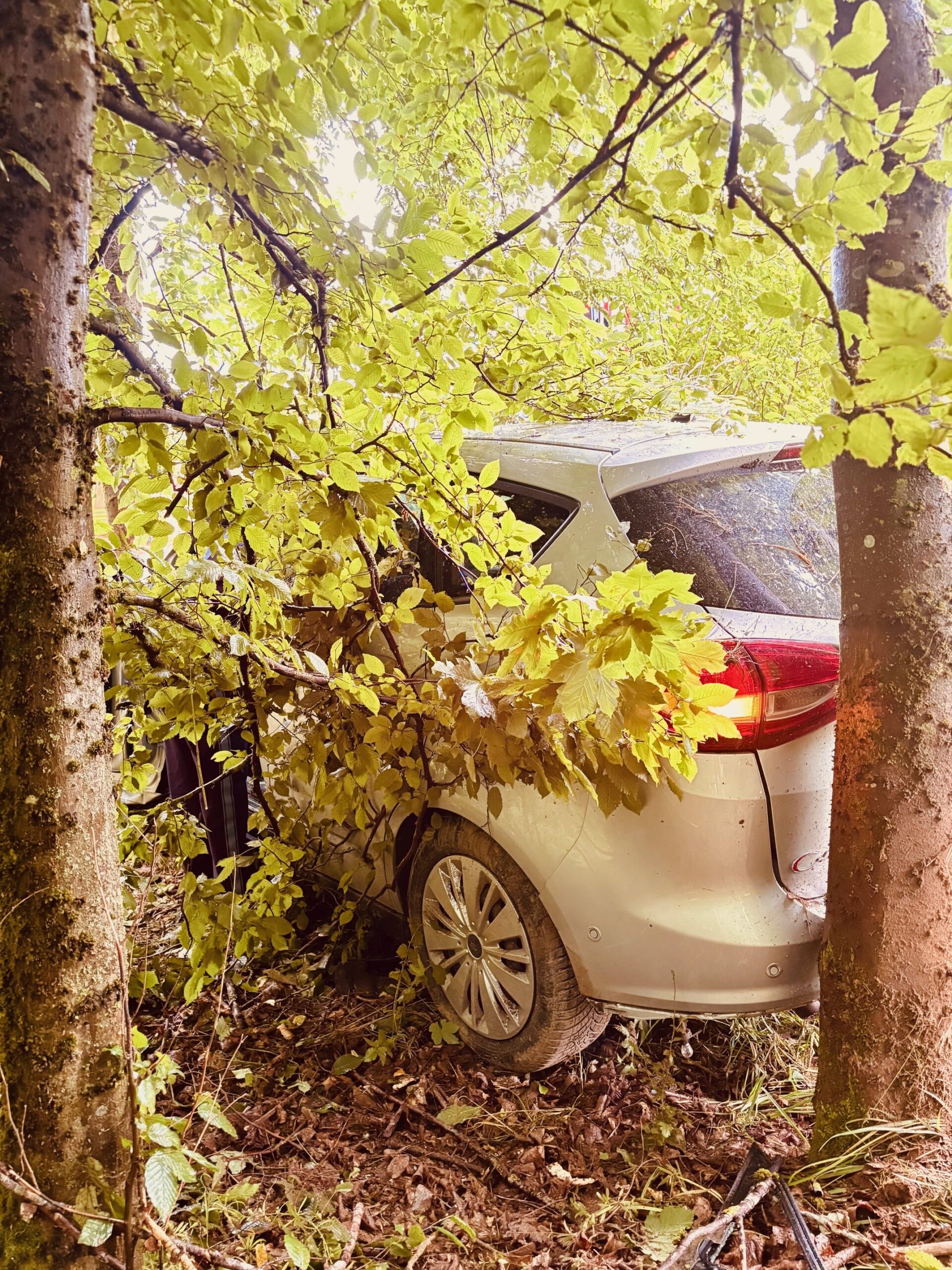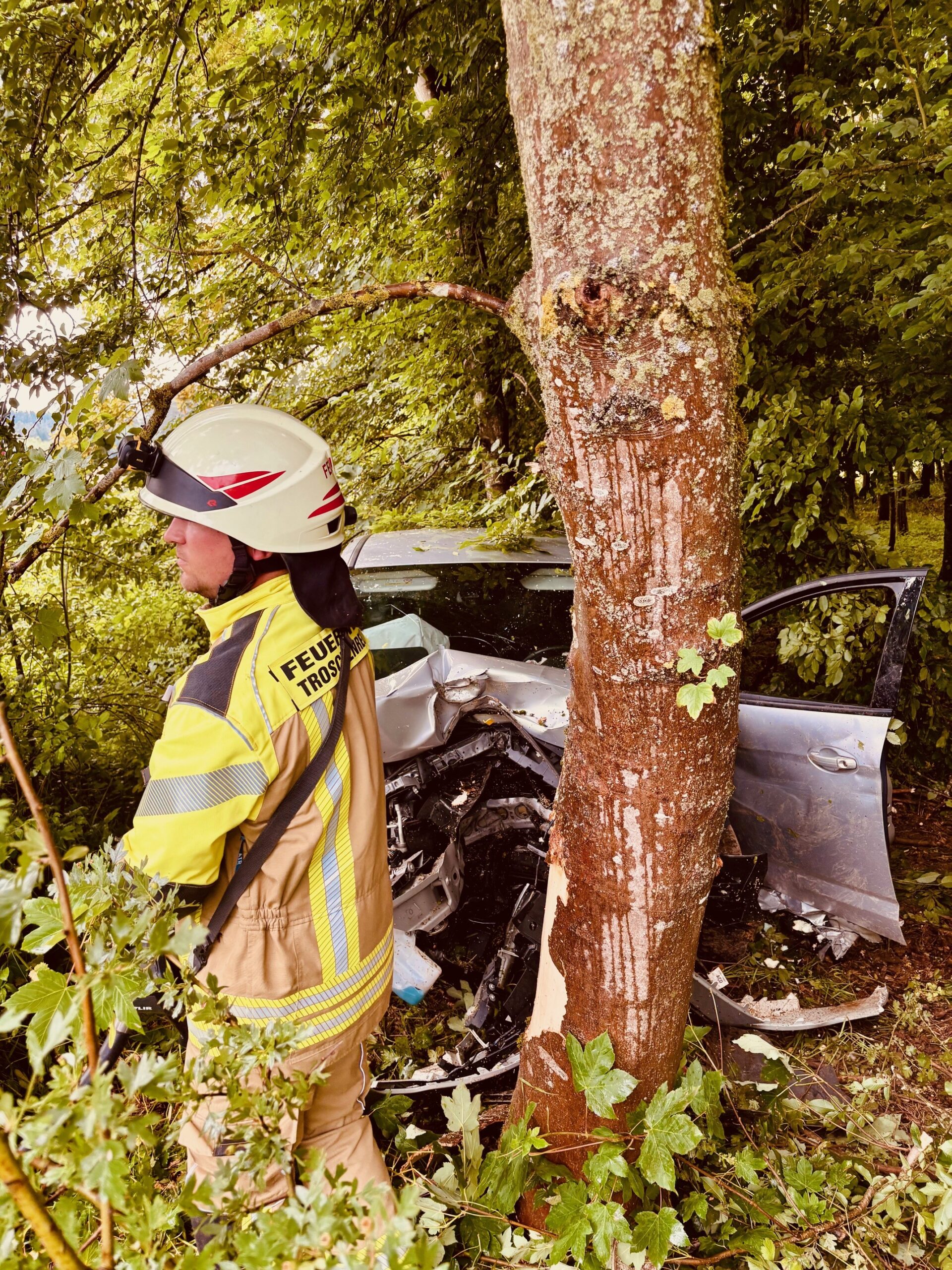 Ein Pkw war aus bislang ungeklärter Ursache von der Fahrbahn abgekommen und prallte in einem angrenzenden Waldstück frontal gegen einen Baum. Durch die Wucht des Aufpralls wurde die Fahrerin in ihrem Fahrzeug eingeschlossen und mittelschwer verletzt.