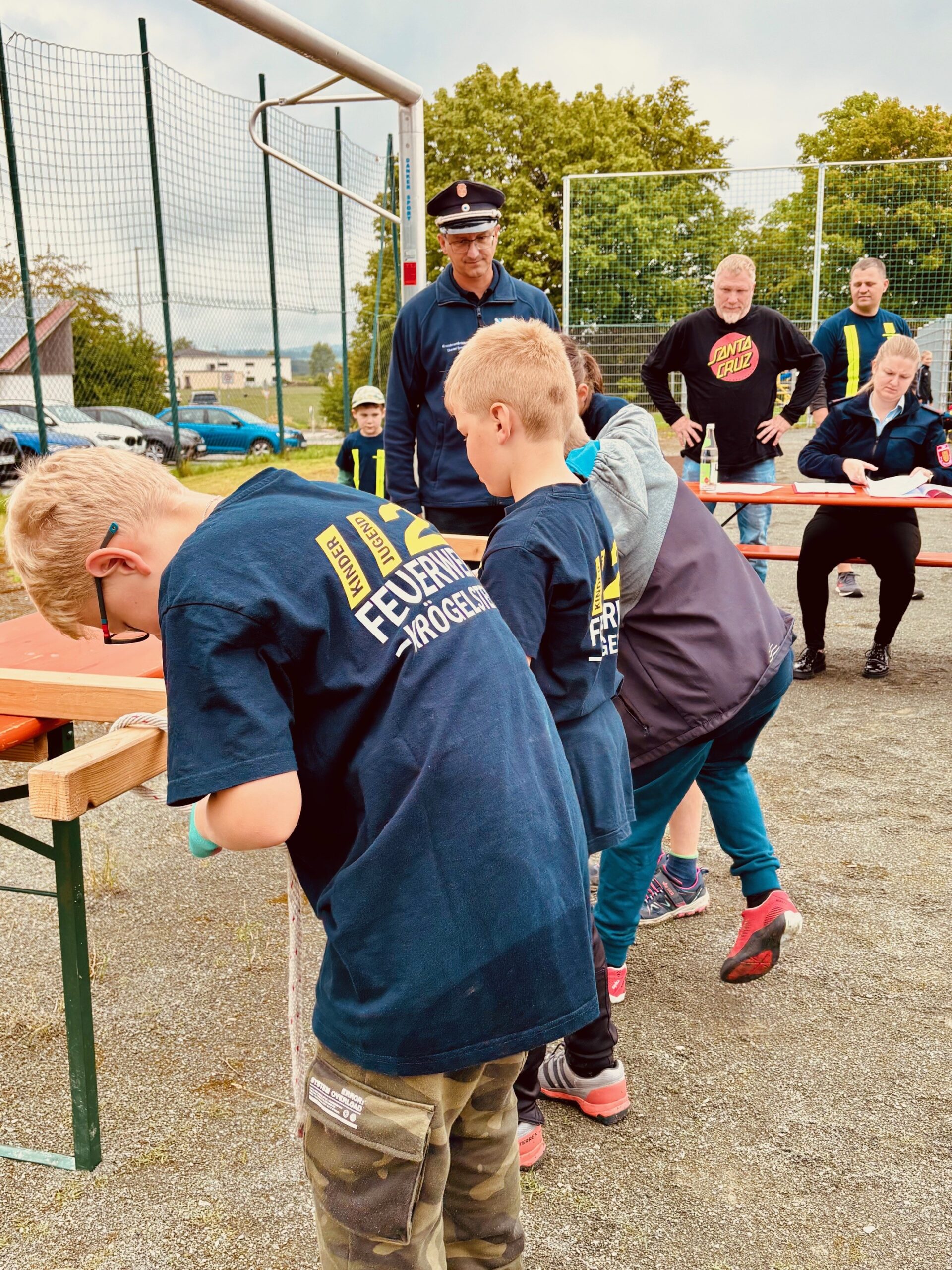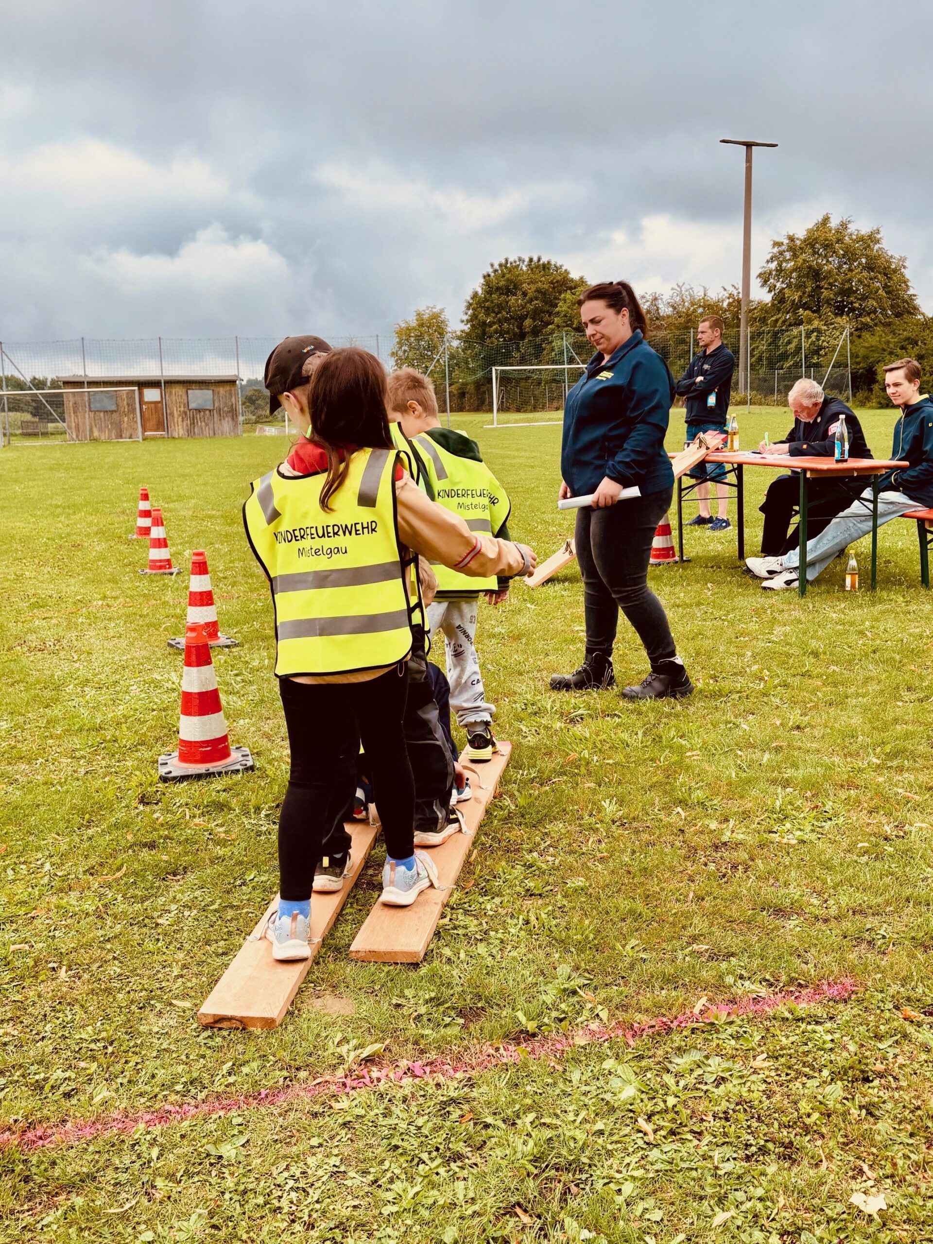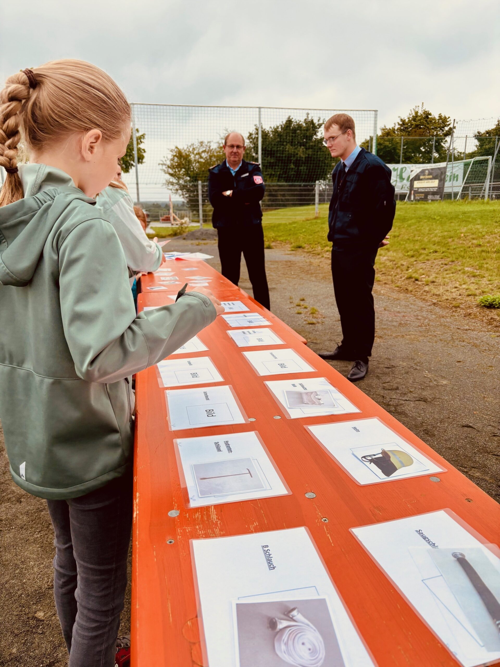 Hochmotiviert begaben sich die sechs- bis zwölfjährigen Mädchen und Jungen auf die abwechslungsreichen Stationen. Spielerisch und altersgerecht konnten sie dabei typische Aufgaben aus dem Feuerwehralltag ausprobieren: Erste Hilfe leisten, Ausrüstungsgegenstände richtig zuordnen, Knoten binden oder eine Überraschungs- und Geschicklichkeitsübung meistern. Besonders knifflig war es, einen Wasserball auf zwei von den Kindern gehaltenen Leinenbeuteln im Gleichgewicht zu halten und vom Startpunkt ins Ziel zu bringen. Teamgeist und Kommunikation waren gefragt, als die Gruppe gemeinsam auf Holzbrettern durch gleichmäßige Schritte ein festgelegtes Ziel erreichen musste. Auch bei den Testfragen bewiesen die Nachwuchsfeuerwehrler ihr theoretisches Wissen.