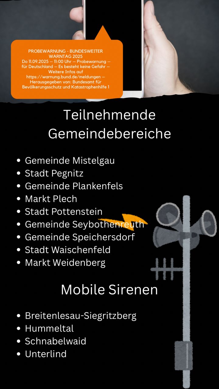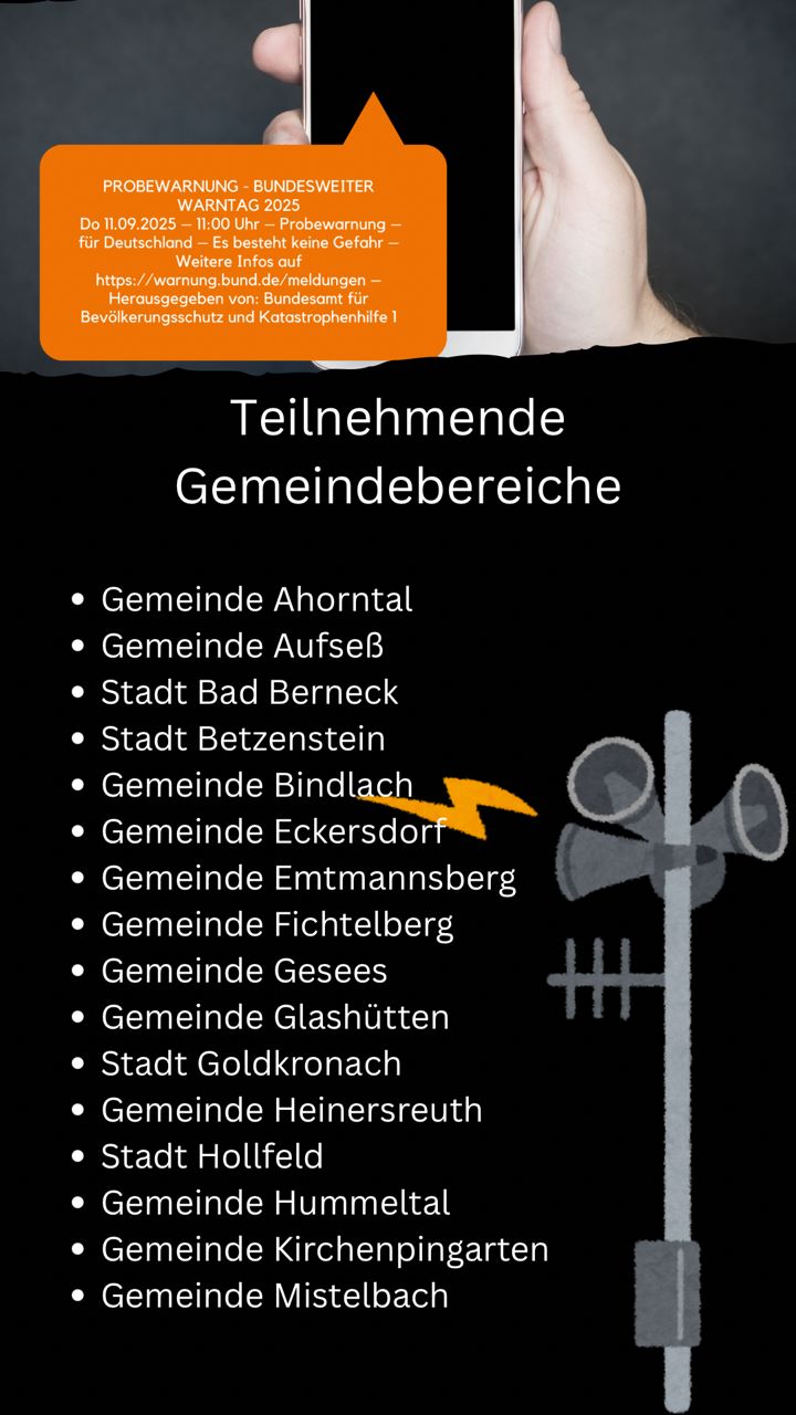 Auch im Landkreis Bayreuth wird der Warntag aktiv durchgeführt. In den nachfolgend aufgeführten Gemeindebereichen ertönen gegen 11:00 Uhr auch die Feuerwehrsirenen sowie mobile Sirenen mit einem einheitlichen Warnton zur Bevölkerungswarnung.