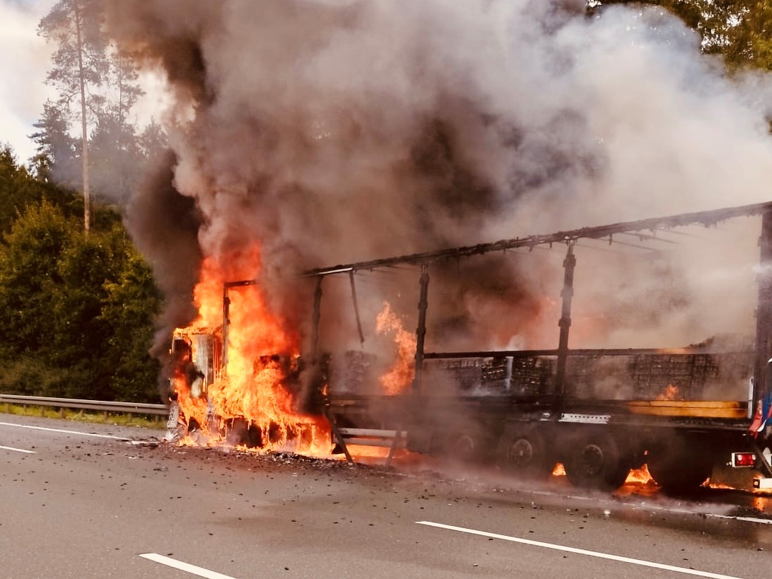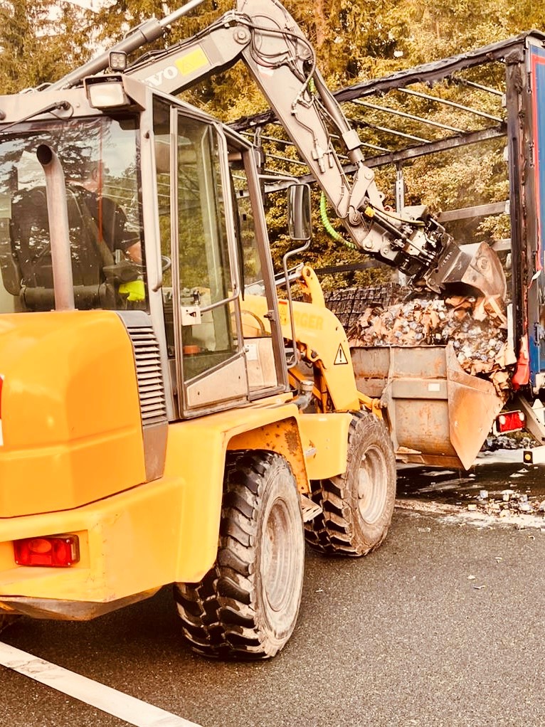 Im Rahmen der weiteren Lageerkundung stellte sich heraus, dass der Lkw rund 23 Tonnen Batterien, zunächst unbekannter Art, geladen hatte. Aufgrund der potenziellen Gefahr wurde das Alarmstichwort erhöht und Spezialeinheiten für Gefahrgut alarmiert. Parallel dazu waren die Löschmaßnahmen bereits eingeleitet. Das Feuer hatte sich zu einem ausgedehnten Vollbrand entwickelt und griff bereits auf die angrenzende Böschung sowie umliegende Bäume über. Immer wieder kam es durch die enorme Hitzeentwicklung zu Explosionen einzelner Batterieteile.