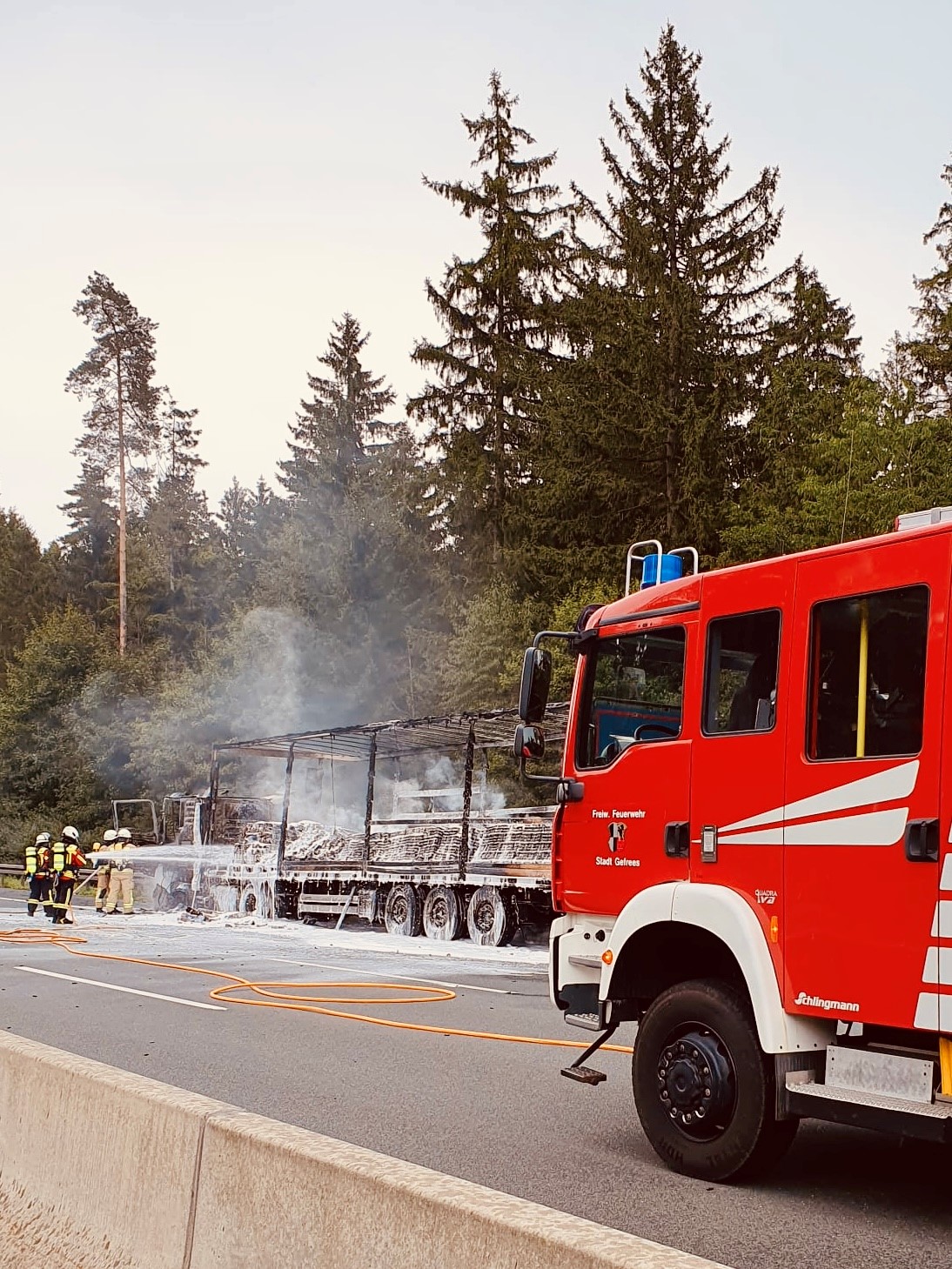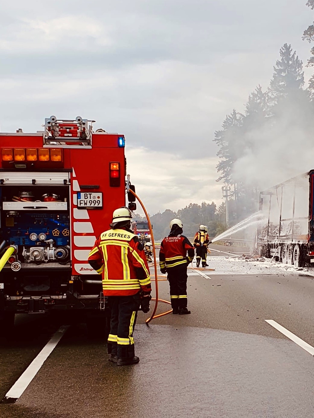 Am 2. September 2025 um 14:06 Uhr gingen in der Integrierten Leitstelle Bayreuth/Kulmbach mehrere Notrufe über einen brennenden Lastkraftwagen auf der Standspur der Bundesautobahn A9 zwischen den Anschlussstellen Gefrees und Münchberg-Süd ein. Augenzeugen berichteten, dass Flammen aus der Zugmaschine schlugen.