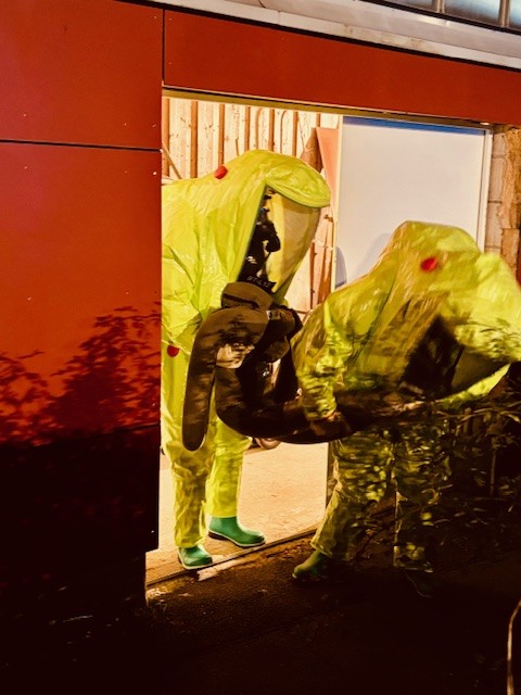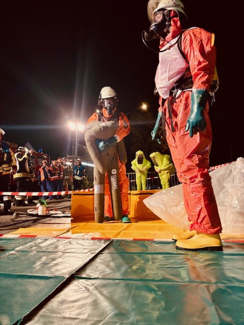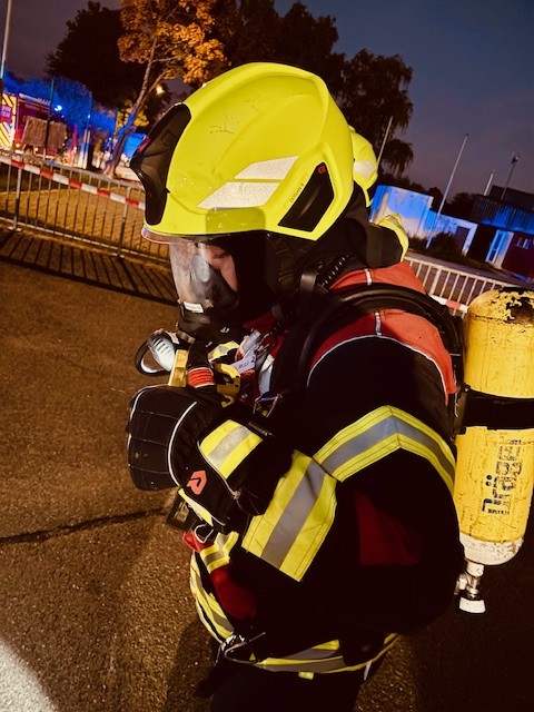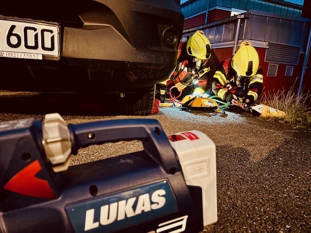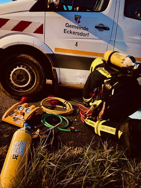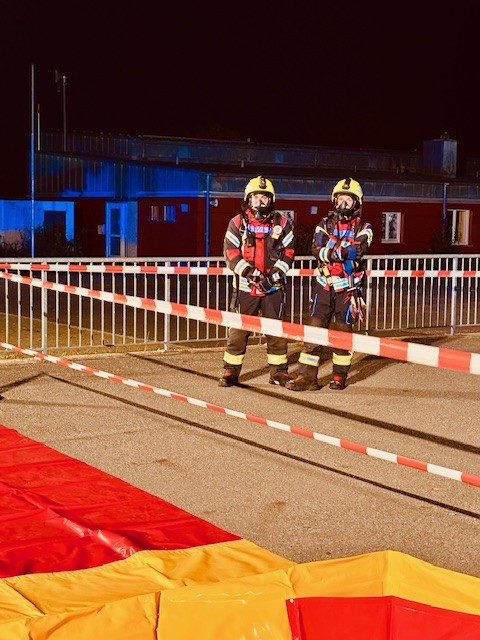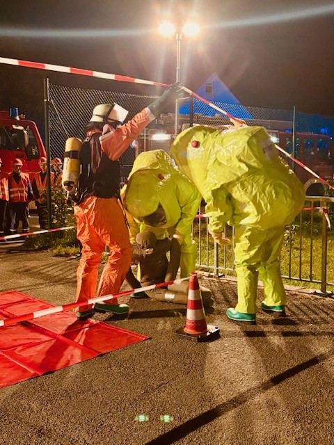 Die Personenrettung durch Atemschutzgeräteträger erfolgte sowohl im hinteren Teil der Schule als auch an einem mit Gefahrgut beladenen Kleintransporter auf der Vorderseite. Hier musste eine „Person“ schnellstmöglich mittels Hebekissen befreit werden.