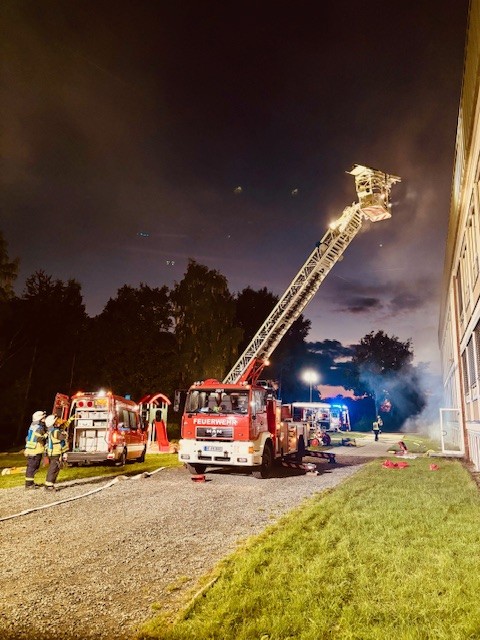 Rund 80 Einsatzkräfte trainierten am Montagabend, den 13. Oktober 2025, in Eckersdorf einen angenommenen Brand in der örtlichen Grundschule. Das Übungsszenario wurde um austretende Gefahrstoffe auf der Vorderseite des Schulkomplexes erweitert. Im Bereich der Heizungsanlage der Schule wurde ein Brandausbruch angenommen. Das Gebäude wurde geräumt, jedoch galten mehrere Personen als vermisst.