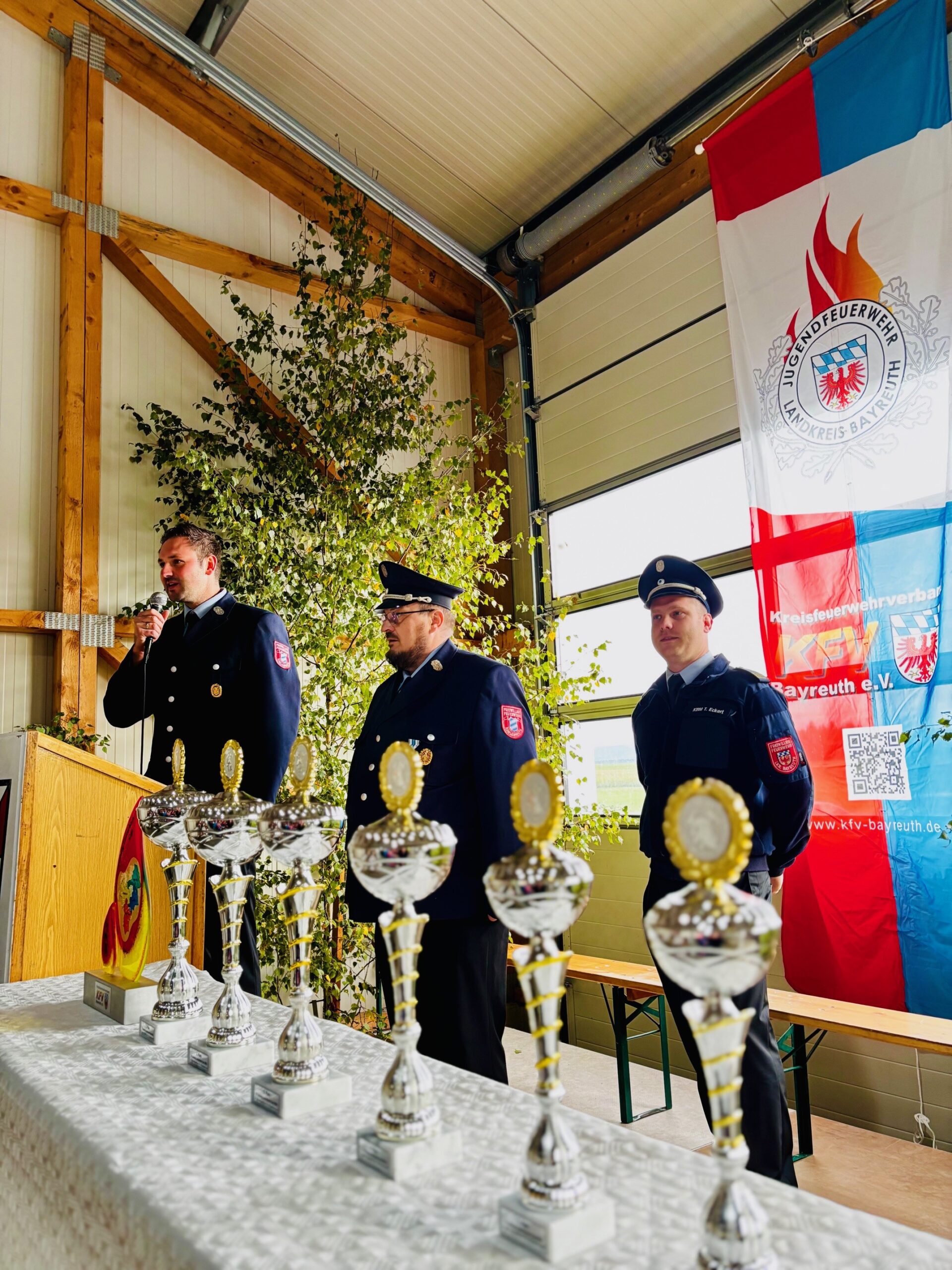Kreisbrandrat Hermann Schreck nutzte den würdigen Rahmen der Veranstaltung, um vier besondere Ehrungen zu vergeben. Die Inspektoren des Landkreises Bayreuth engagieren sich das ganze Jahr über unermüdlich für die Belange der Feuerwehren – insbesondere auch für die Jugendfeuerwehren, etwa durch die jährliche Ausrichtung der Jugendfeuerwehrleistungsmärsche auf Inspektionsebene.