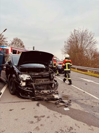 Gestern (14.11.2025) wurden Feuerwehr und Rettungsdienst kurz nach 14:30 Uhr zu einem schweren Verkehrsunfall nach Bindlach alarmiert. Entgegen der ersten Meldung über den Notruf, nach der eine Person in ihrem Pkw eingeklemmt sein sollte, wurden die Insassen der beteiligten Fahrzeuge nur leicht verletzt.