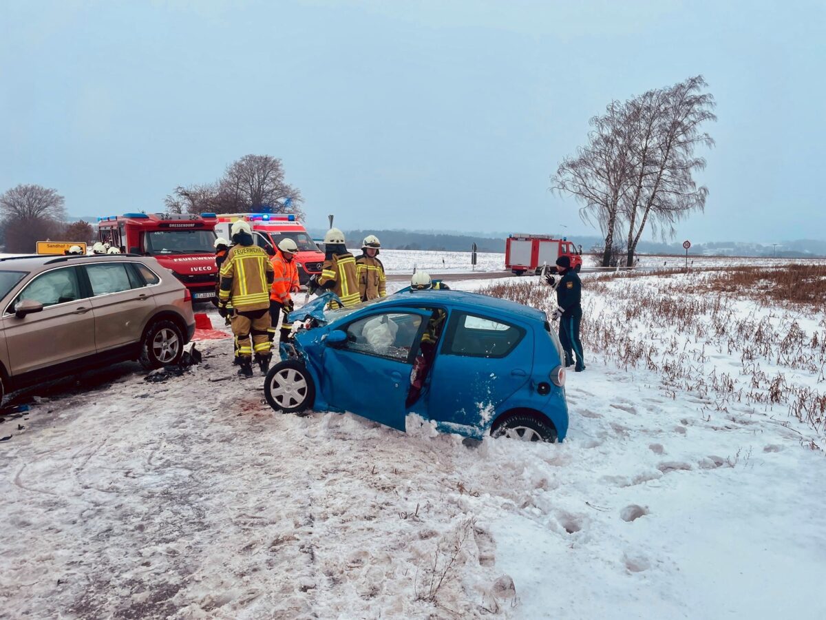 Zu einem schweren Verkehrsunfall mit mehreren zunächst gemeldeten eingeklemmten Personen wurden die Freiwilligen Feuerwehren Dressendorf und Nemmersdorf am 12.01.2026 gegen 13:30 Uhr alarmiert. Gemeinsam mit dem Einsatzleiter Rettungsdienst, zwei Rettungswagen, einem Krankentransportwagen und einem Notarzteinsatzfahrzeug des BRK Kreisverbandes Bayreuth sowie der Polizei ging es zur Staatsstraße 2163 auf Höhe der Ortsausfahrt Dressendorf in Richtung Goldkronach.