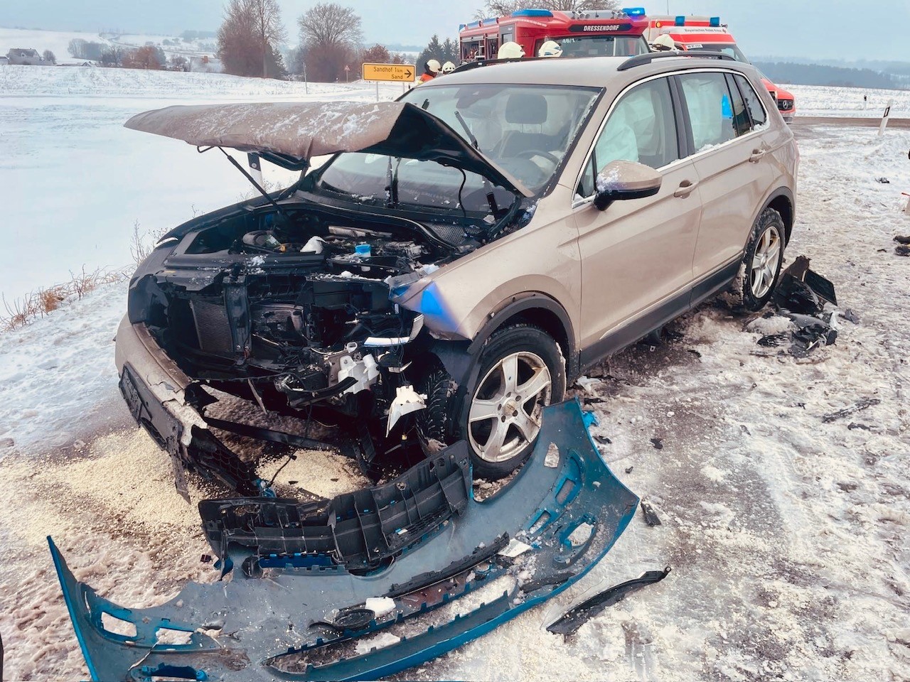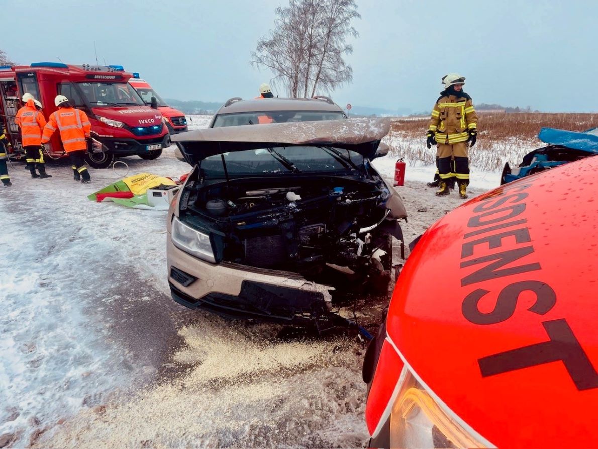 Zu einem schweren Verkehrsunfall mit mehreren zunächst gemeldeten eingeklemmten Personen wurden die Freiwilligen Feuerwehren Dressendorf und Nemmersdorf am 12.01.2026 gegen 13:30 Uhr alarmiert. Gemeinsam mit dem Einsatzleiter Rettungsdienst, zwei Rettungswagen, einem Krankentransportwagen und einem Notarzteinsatzfahrzeug des BRK Kreisverbandes Bayreuth sowie der Polizei ging es zur Staatsstraße 2163 auf Höhe der Ortsausfahrt Dressendorf in Richtung Goldkronach.