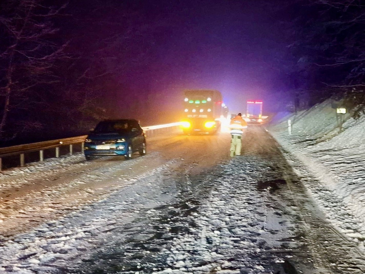 Ein LKW geriet auf der spiegelglatten Fahrbahn in den Gegenverkehr und kam in einer Leitplanke zum Stehen. Das Fahrzeug musste durch ein Abschleppunternehmen geborgen werden. Verletzt wurde niemand. Die B303 war von Bischofsgrün in Richtung Bad Berneck zeitweise vollständig gesperrt. Nachdem der LKW entfernt und die Bundesstraße durch den Winterdienst geräumt worden war, konnte sie wieder für den Verkehr freigegeben werden. Anhaltender starker Schneefall hatte die Lage zusätzlich erschwert. Über zwei Stunden waren rund 25 Einsatzkräfte eingesetzt.