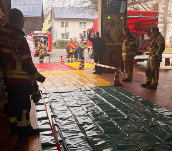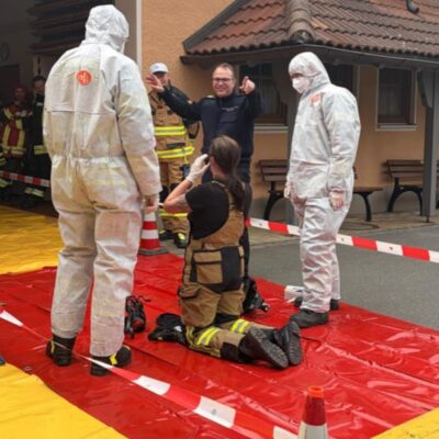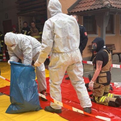 Den inhaltlichen Schwerpunkt bildete eine umfassende, realitätsnahe Stationsausbildung. Dabei wurden abgestufte Einsatzszenarien systematisch dargestellt. Beginnend bei einfachen Dekontaminationsmaßnahmen unter eingeschränkten personellen und materiellen Ressourcen, über den strukturierten Aufbau eines mittleren Hygieneplatzes bis hin zur Einrichtung eines umfangreichen Hygieneplatzes für größere Schadenslagen. Insbesondere die standardisierte Unterstützung beim Ablegen kontaminierter Schutzkleidung von Atemschutzgeräteträgern wurde unter praxisnahen Bedingungen intensiv trainiert.
