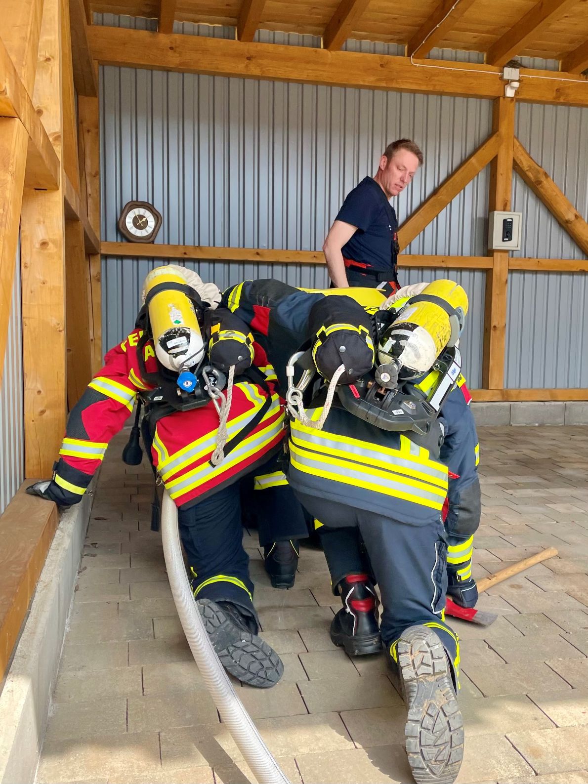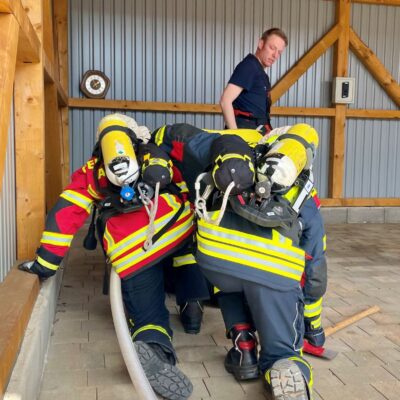 Der Lehrgang vermittelte nicht nur fundiertes theoretisches Wissen, sondern legte großen Wert auf eine praxisnahe Ausbildung. In verschiedenen Stationsausbildungen – etwa zur Türöffnung, zum Absuchen von Räumen, zum Verhalten in Notfalllagen sowie zum Transport von Verletzten – sammelten die Teilnehmenden erste praktische Erfahrungen im Umgang mit dem Atemschutzgerät, teilweise sogar unter Nullsicht.
